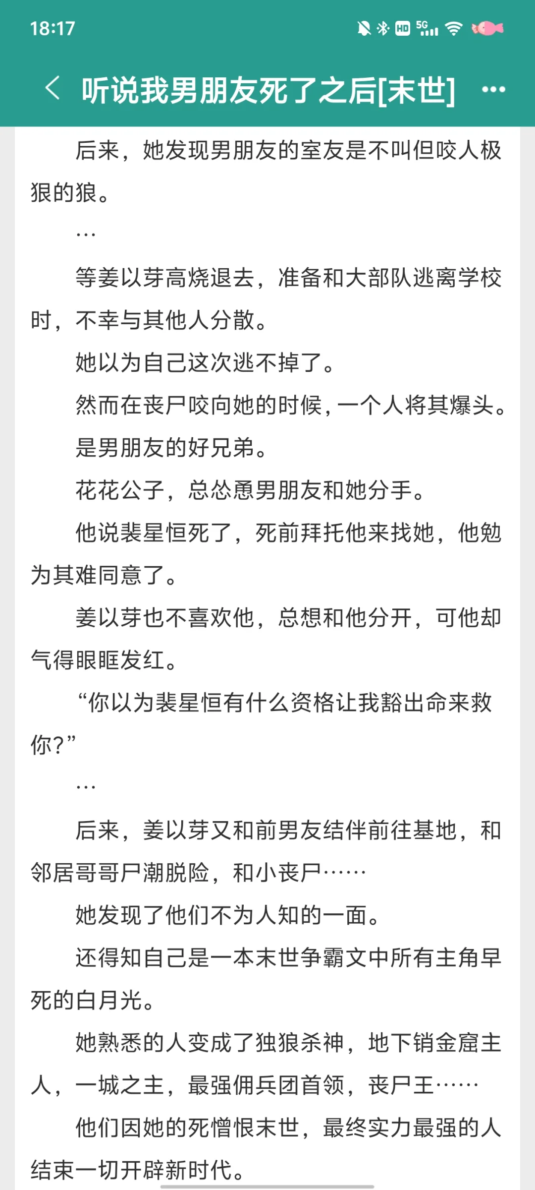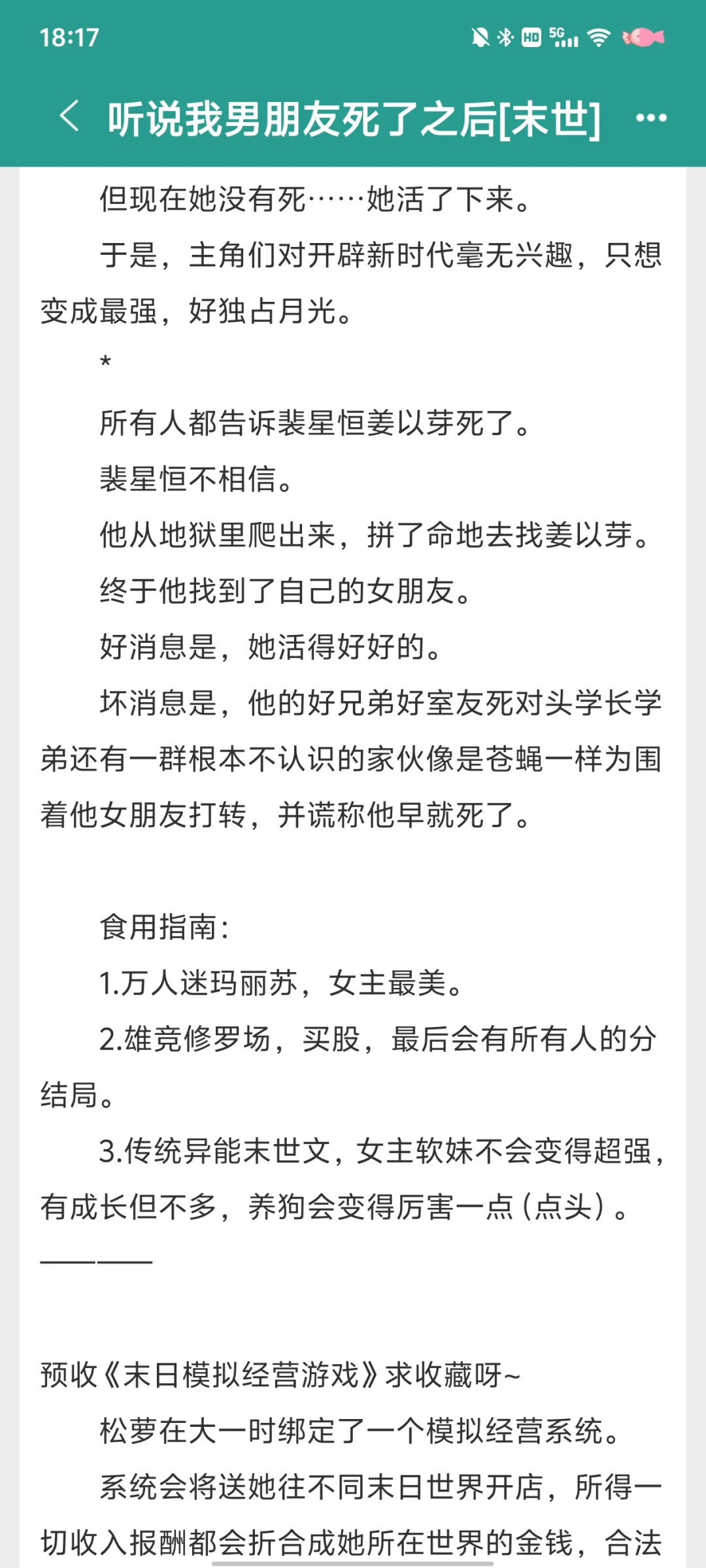 又来一个人高马大的暗恋者和女主表白,女主没有答应。女主觉得自己一个人力量微小,可能在末世过不下去,想着是不是要找个新男朋友了。