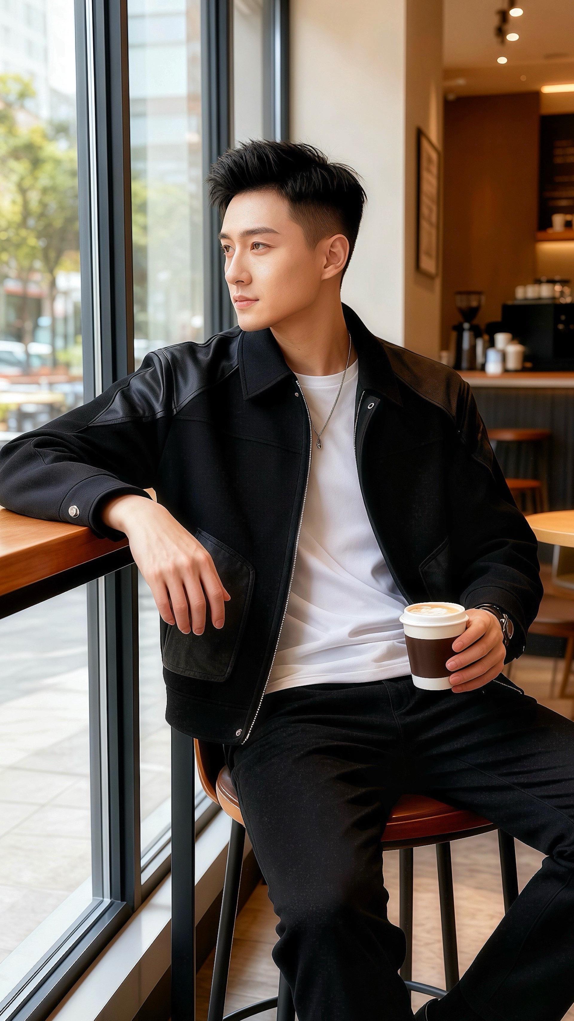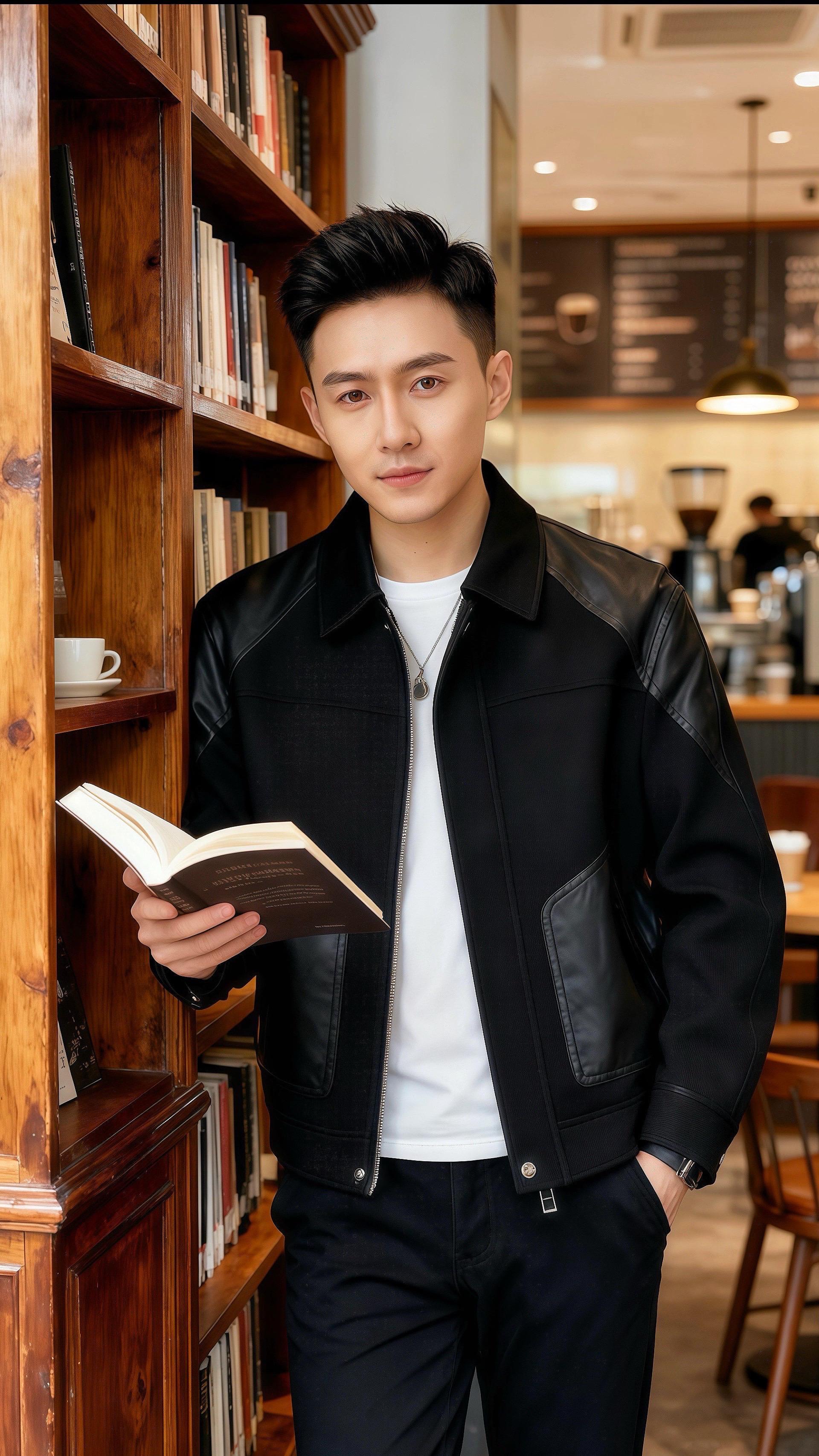 皓明抬眼笑,转去书架取书时,夹克下摆顺着腰线晃了晃,黑裤的垂感裹着腿弯,连腕上的表链都成了冷调里的细闪。“你今天像把‘安静的好看’穿在了身上,”许妍递过拿铁,指腹碰了碰他夹克的口袋边,“比窗边的梧桐影还耐看。”