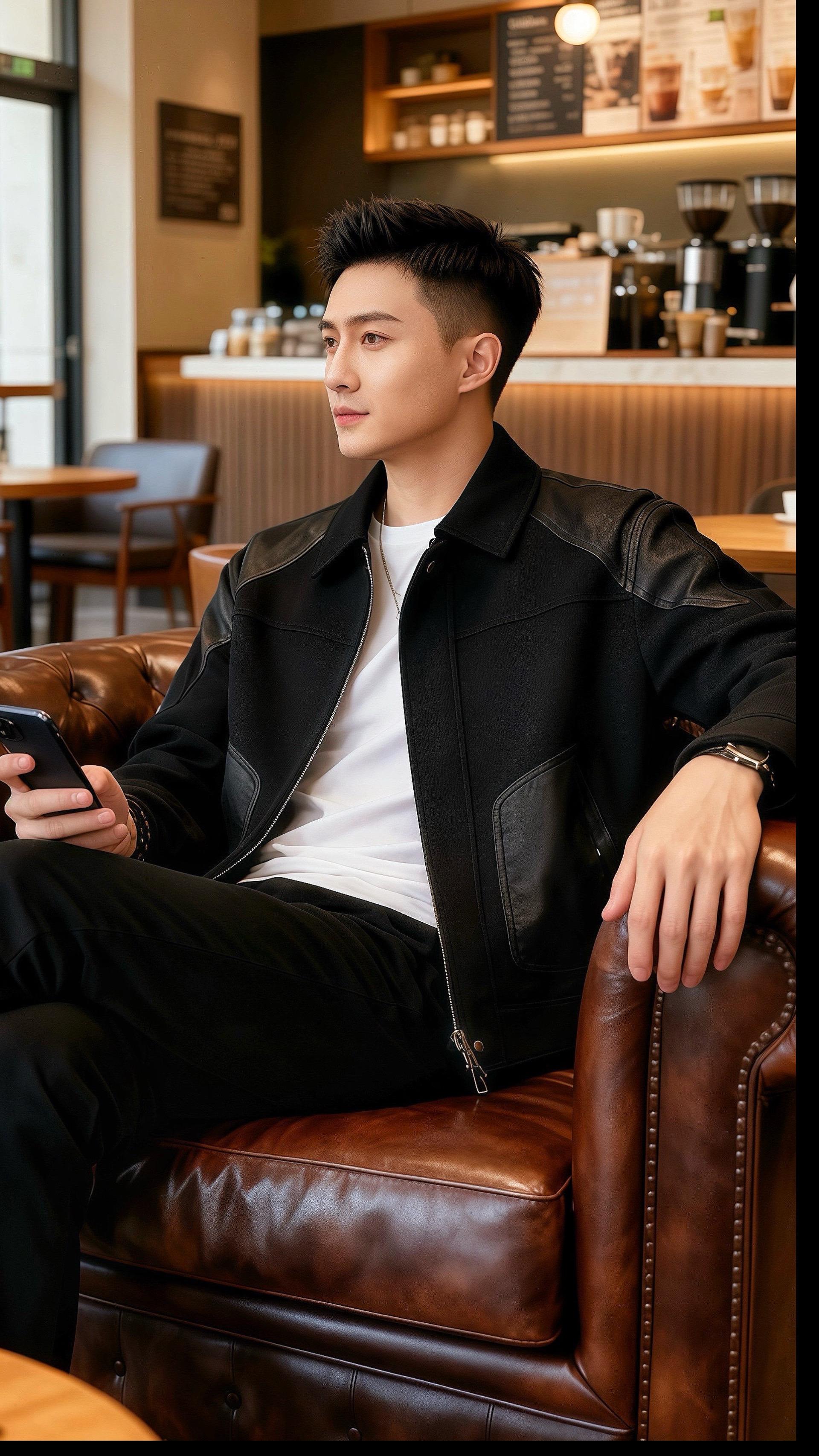 他今天穿的黑夹克很有意思——哑光面料衬着皮质拼接,像把夜色裁了块贴在肩线,拉链滑到胸口,露出的白T恤成了最软的过渡。许妍放包时指尖蹭过他袖边:“这衣服比你上次那件多了点‘藏起来的利落’,像把故事缝在拼接缝里。”