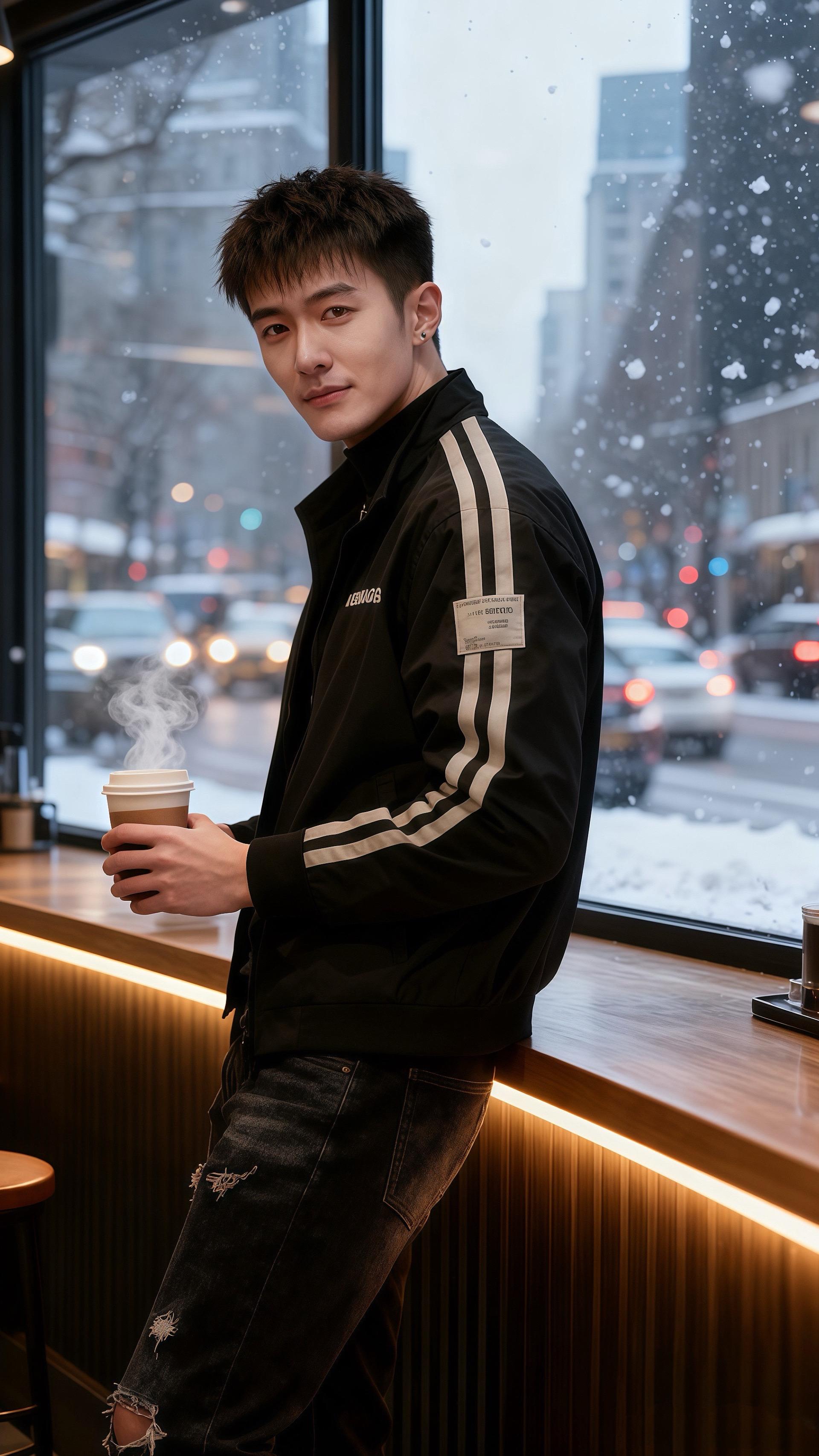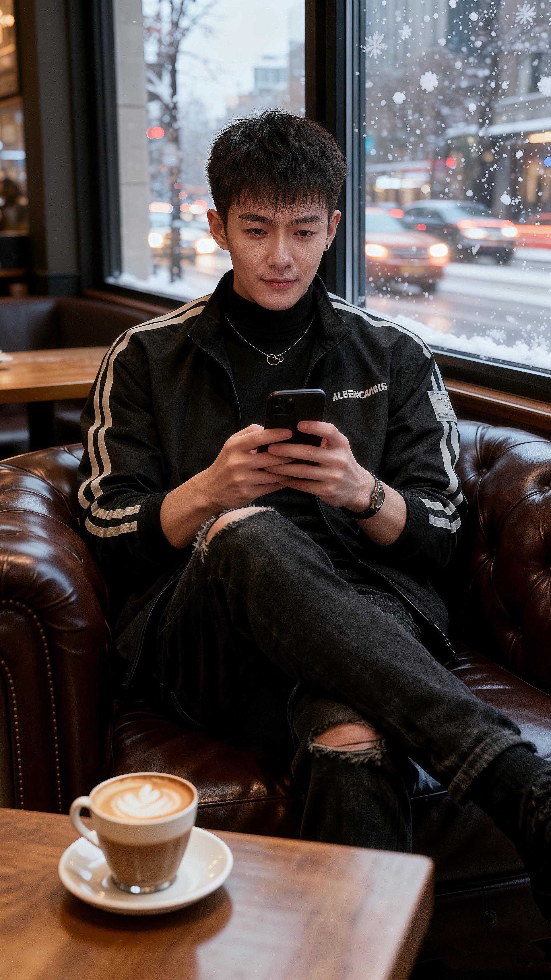 窗外的车水马龙被雪覆盖,变得温柔而朦胧。他偶尔低头,目光落在手机屏幕上,手指轻轻滑动,似乎在浏览着什么。咖啡的香气在空气中弥漫,与窗外的寒意形成鲜明对比。