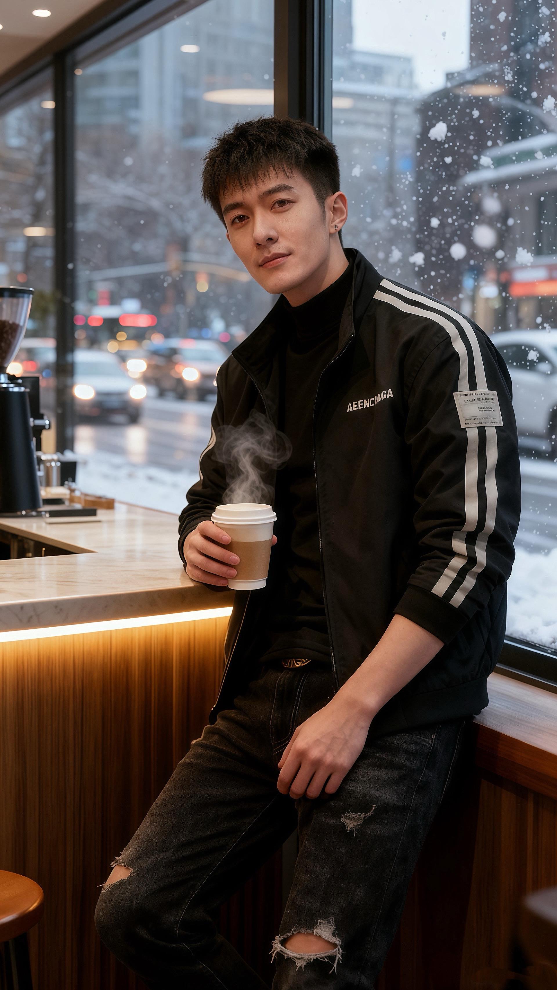 他坐在靠窗的位置,手里捧着一杯冒着热气的咖啡。黑色夹克上的三条白色条纹在暖黄的灯光下格外显眼,袖口的标签上印着“AEENCIAGA”的字样,低调而不失质感。黑色高领毛衣衬得他面容清俊,耳垂上的银色耳钉在灯光下闪烁着微光。