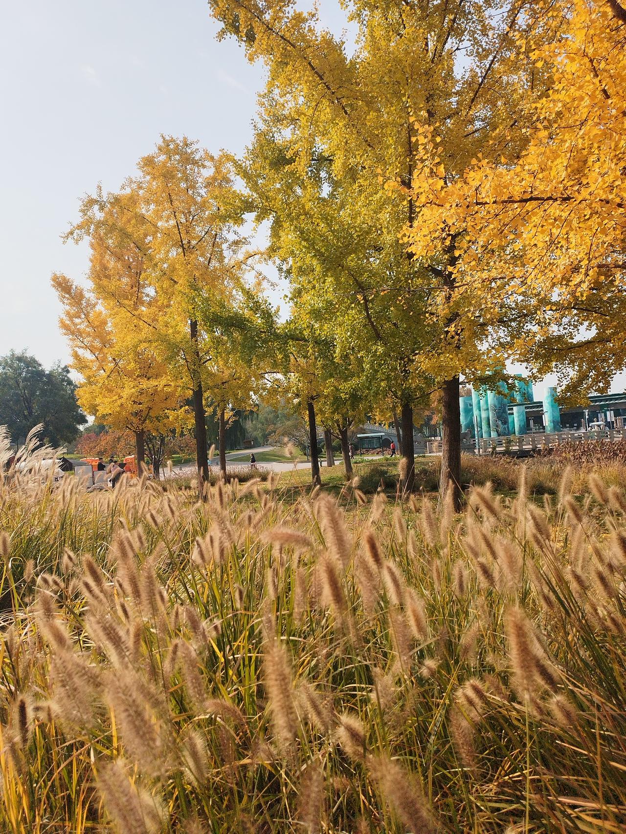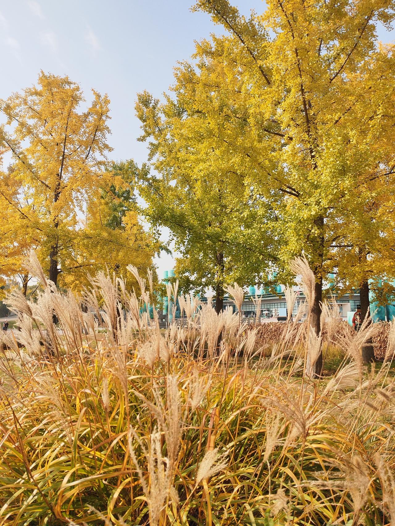 可以分享一张秋景的树叶的照片吗?昨天去浐灞湿地公园拍的,公园很大,处处都有金黄的树和草,真的很漂亮。