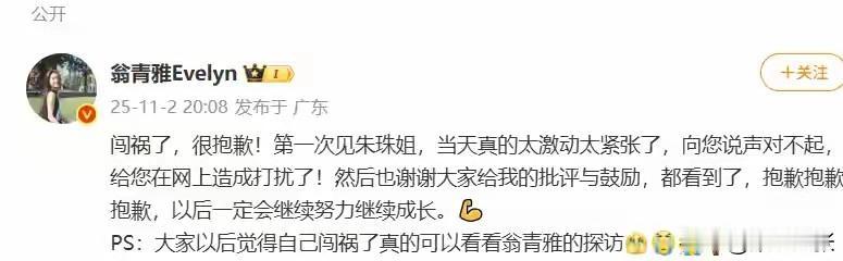 11月1日,《心动的信号7》女嘉宾翁青雅跨界主持采访资深演员朱珠,现场状况百出,成“社交灾难现场”,话题迅速冲上热搜。翁青雅进门后自顾自,采访卡顿、毫无想法,网友直呼尴尬,质疑其业务能力。但也有人认为新人紧张正常,呼吁少些苛责。 2日晚,翁青雅向朱珠道歉,称首次见面太过激动紧张。翁青雅毕业于伦敦艺术大学传媒学院,参加综艺时曾被赞“顶级白富美”。朱珠作品丰富,《玫瑰的故事》《乔家的儿女》都是代表作。望翁青雅吸取教训,日后主持别再如此糟糕。