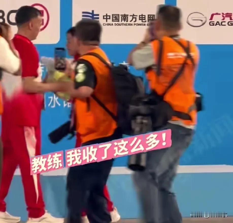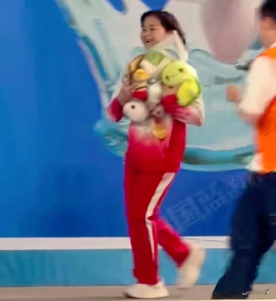 哈哈,全红婵一出来,现场气氛立马变活泼了[呲牙]人长高了也长宽了,长发飘飘有点不适应,疯狂甩头[捂脸]但实力依然在,拿了奖牌还兴冲冲跑去收粉丝的礼物,给孩子高兴坏了[祝福]教练也宠,随身带着大袋子给她装礼物[耶]