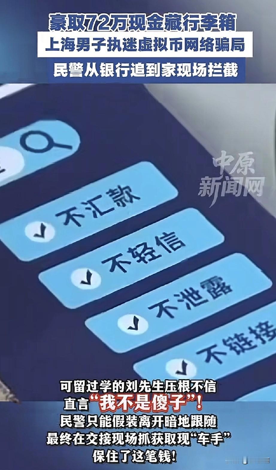 “执迷不悟!”男子在银行柜台取款72万现金,工作人员察觉不对劲后悄悄报警,民警赶到他家时,他正用行李箱推着现金往外走,民警在他的手机中发现一款投资虚拟货币的APP,于是苦口婆心的劝说:这是杀猪盘式的诈骗,而男子振振有词:“我一个海外留学生不是傻子,现在用几十万可以搏一搏上千万的收益,这样的机会一辈子也遇不到几次!”看劝说无果,民警假装离开,而后悄悄的跟随着他。果然,男子带着现金去见了接头人,交易现场,民警控制住了前来取现金的车手,车手交代,每次取现可以得到300块钱的好处。这时候男子才醒悟,感谢民警让自己保住了这72万元! 所以说在防诈这块银行还是起到关键作用的,有些人在取钱的时候抱怨银行多管闲事,我觉得完全没有必要。