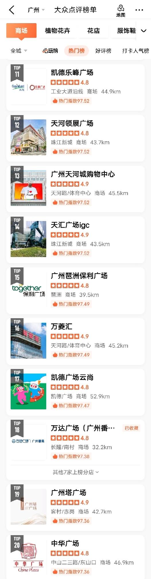 根据最新大众点评消费热度跟数据排名,广州商场人气前20排名如下,天环,正佳广场,四海城位居前三,其中天环跟正佳表现很稳定,一直长期霸占人气榜前二,四海城得益于年底一系列针对年轻人的活动体验,如中秋国庆,万圣圣诞跟元旦等造势,深受年轻人欢迎。涉及到商圈,天河路商圈仍然领先,但长隆万博商圈追的很猛,其中四海城,长隆k11,番禺天河城杀进前十且排名靠前。 万博商圈开卷对广州商业绝对是好事,尤其对全体广州市民。长期以来,天河路商圈一家独大,养尊处优,广州商业一直停滞不前,当万博商圈,白鹅潭商圈兴起,有了市场竞争,广州商业体验之会越来越好,有竞争才有更好的体验跟服务。对此,你怎么看,评论区聊聊~