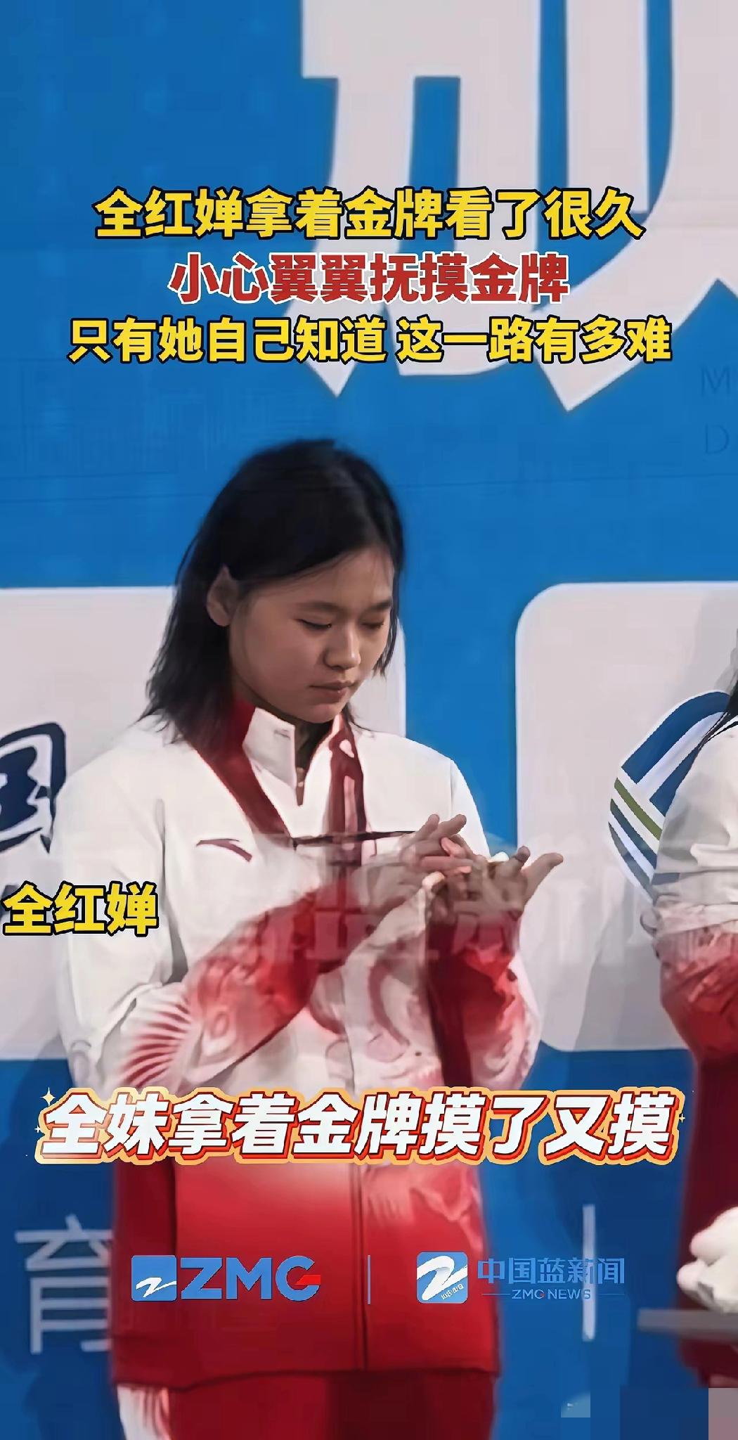 我真的没有想到, 全红婵夺冠摘金后, 没有欢呼雀跃也没有喜极而泣,一个小动作却让无数人破防! 站上领奖台,金牌刚挂上脖子,她没忙着举牌拍照,反而低下头静静盯着金牌,用缠着白色胶布的左手轻轻摩挲,那眼神里的珍视,比任何庆祝都更打动人。 这枚金牌哪里是运气,分明是她用无数个贴满膏药的夜晚、脚踝积液打针的疼痛、克服身体发育的迷茫拼来的! 别人只看到16岁少女的天赋异禀,却忘了她在跳台上一次次忍着疼起跳,加练到深夜的坚持。 比起刻意的庆祝,这份沉默的珍视才最戳心——她摸的不是金牌的荣光,是自己熬过的所有苦。 少年负壮气,奋烈自有时,全红婵的低调与坚韧,才是顶流该有的样子! 你被婵宝这个小动作打动了吗? 你印象里她最让人难忘的瞬间是什么?