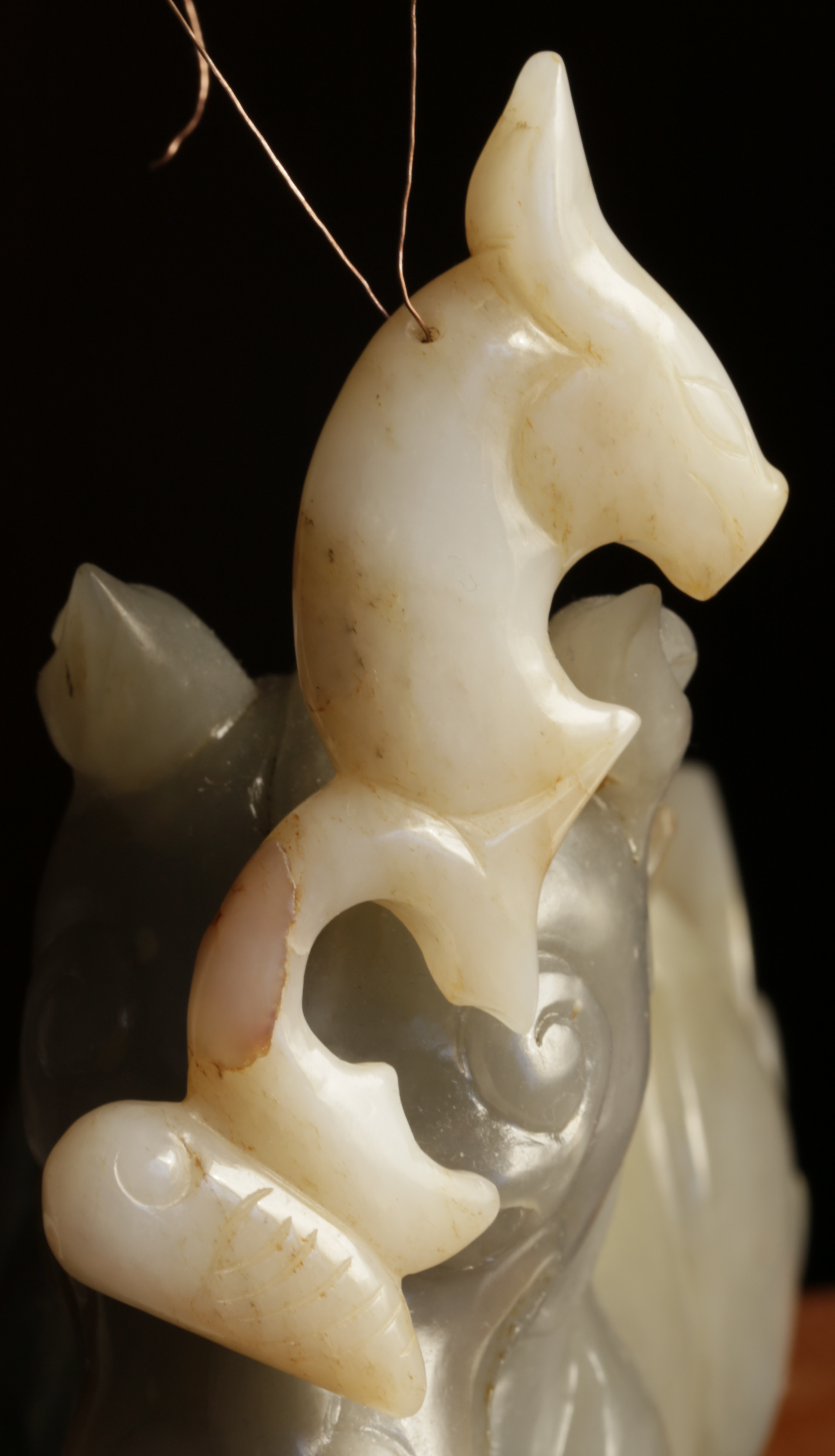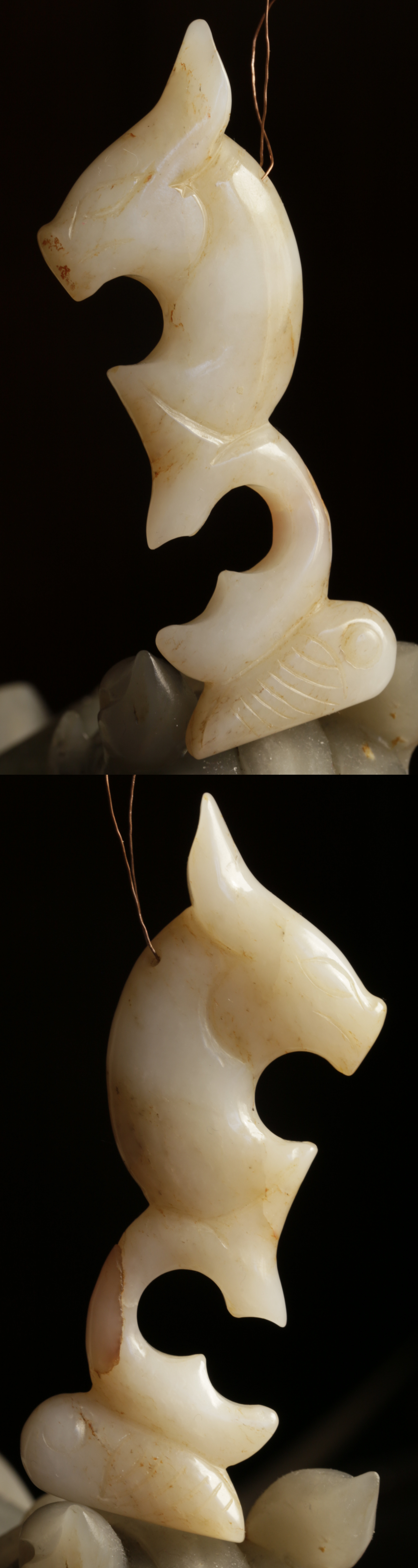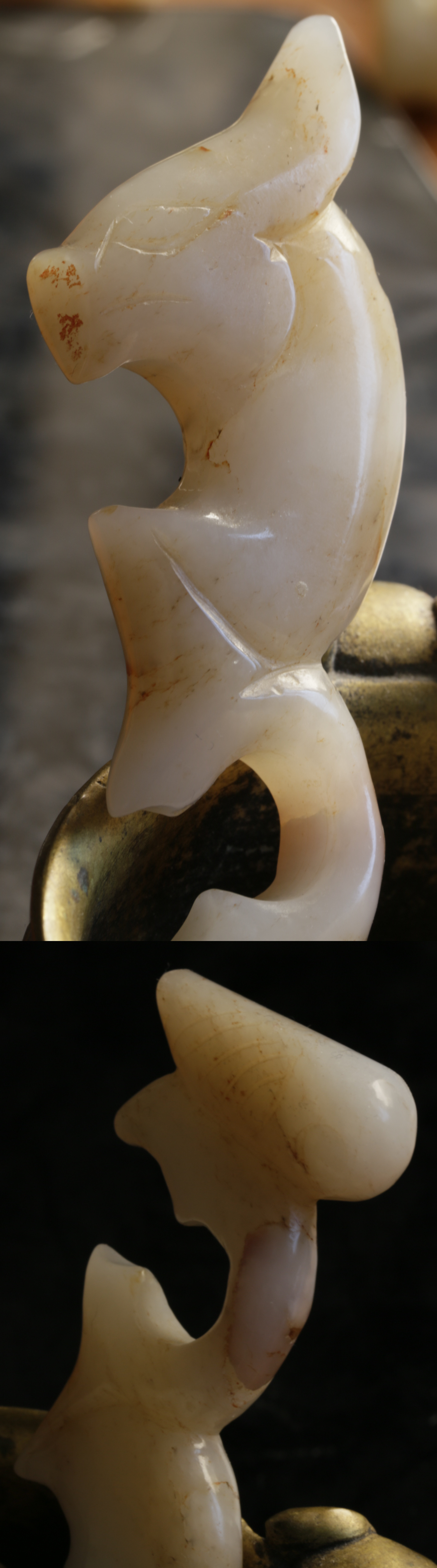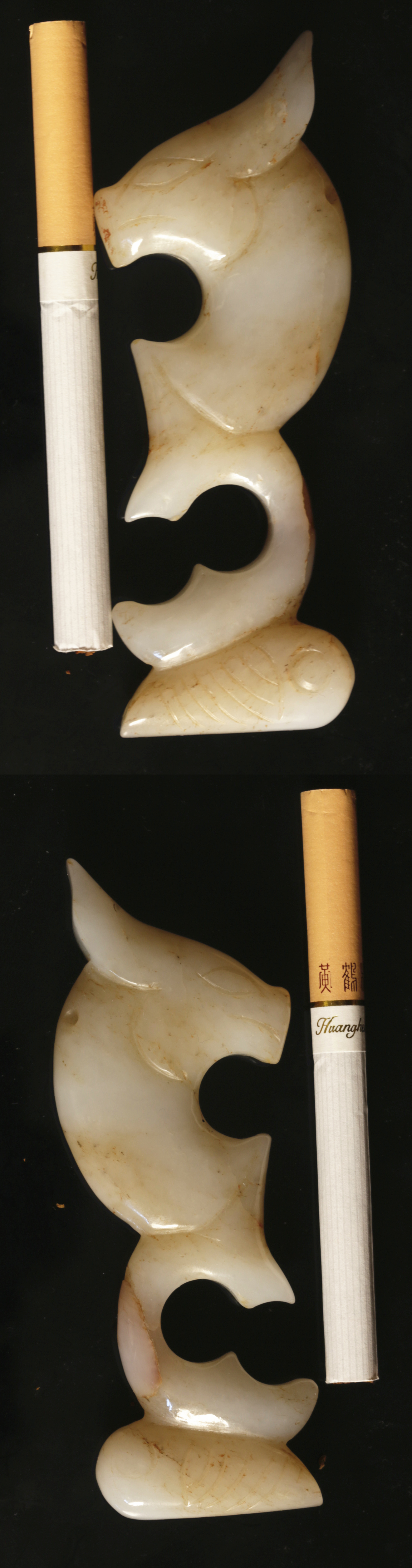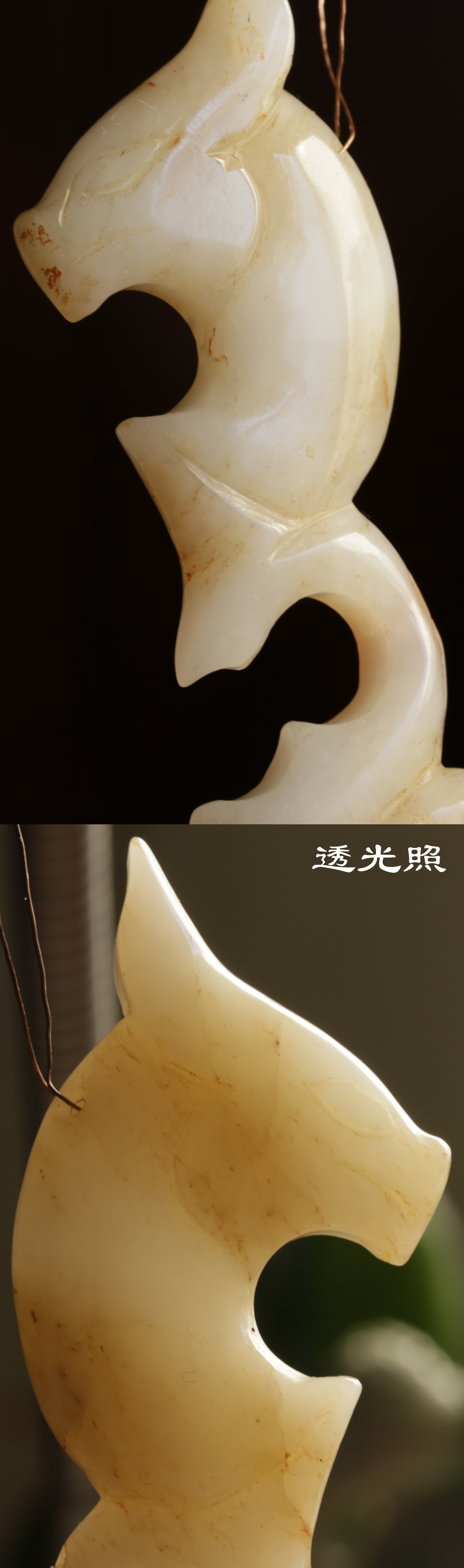 本品器形既鲜明有较为独特,其分上下两个组成部分,上部为龙形首,下部浮雕一只蝉,尾部呈勾形,其中,大龙大眼,上唇上翘,红山龙形风格一目了然。而中部蝉形鲜明,两翼线条分明,蝉鼓凸双眼,形象逼真。龙形为红山玉器典型造型,而蝉亦是红山玉器中较为常见的形态(公开所见为独立蝉形),因此,龙蝉组合于一起,虽然公开极罕见,然而这两种形态,皆为红山玉器典型的题材之一,故,二者组合在一件玉器之上,亦完全合乎情理,并无值得大惊小怪之处。漂亮,油润,型好,白润,古玉。