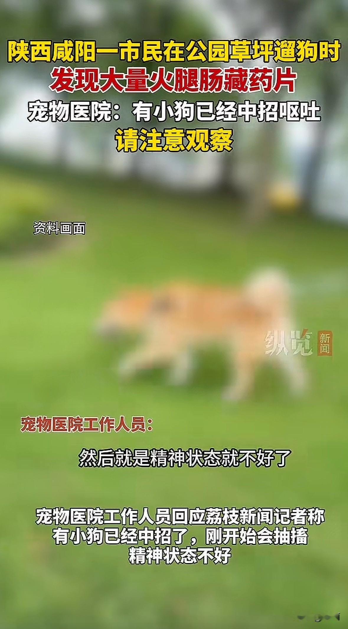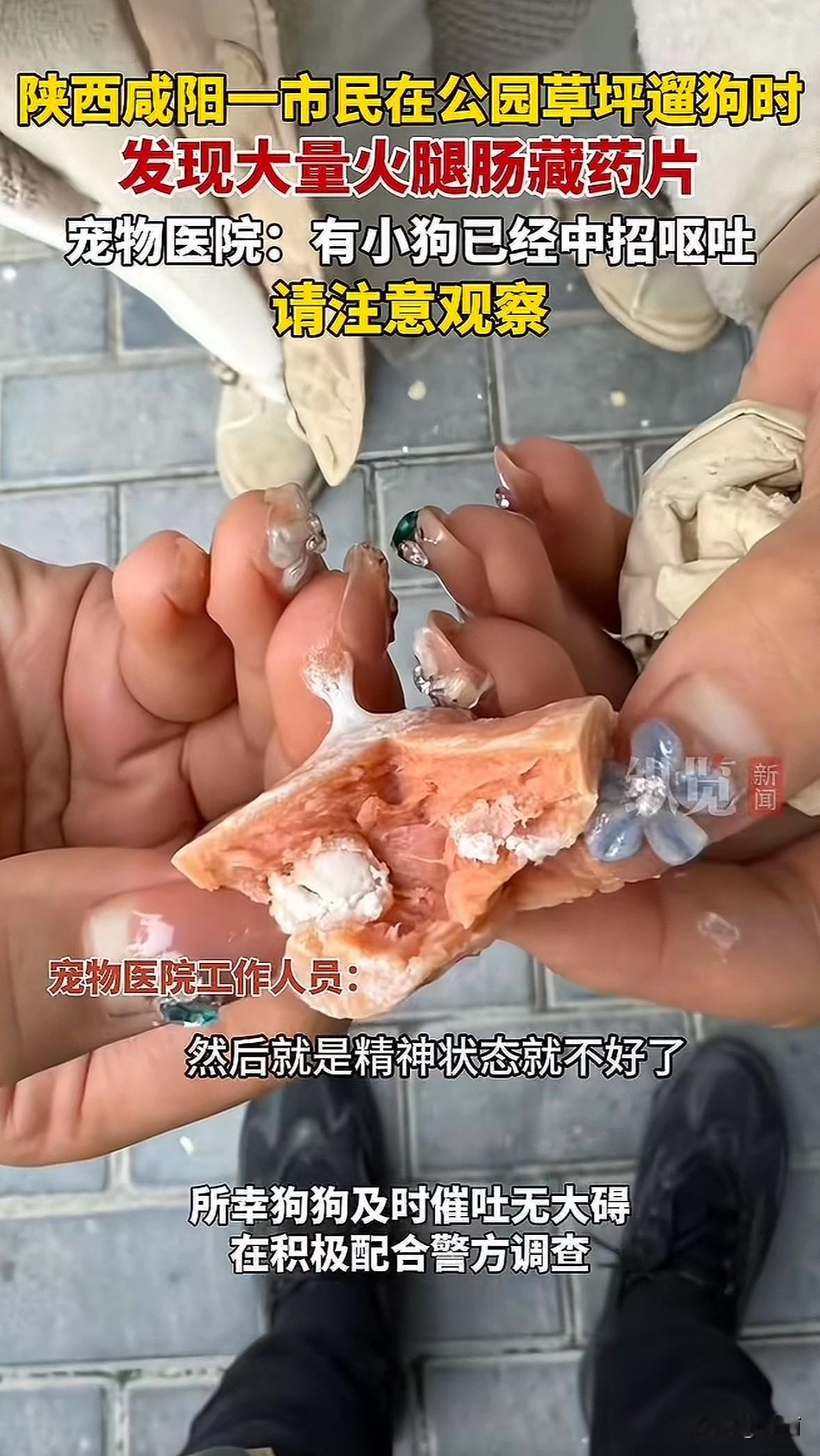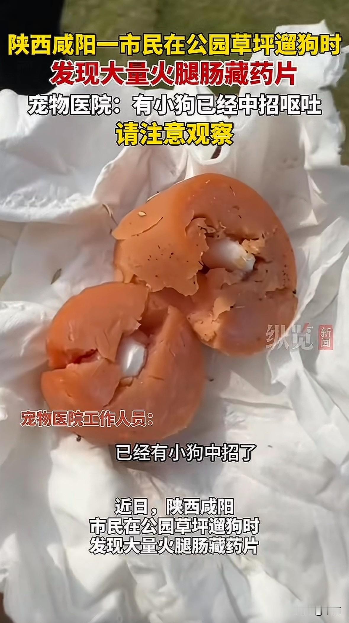 11月2日陕西咸阳两寺渡公园,有人在草坪放了不少藏白色药片的火腿肠。有市民遛狗时,爱犬误食后口吐白沫,送医催吐才没事,宠物医院说已经有小狗中招抽搐呕吐。 这种行为太危险了,公园是公共场所,不光害宠物,小孩误食后果不堪设想。藏的药可能是硝氯酚,对人和宠物都有毒。有案例显示,公共区域投毒可能犯投放危险物质罪,会被判刑。 有矛盾可以好好解决,别用这种极端方式。养宠人出门也要看好自家狗,牵好绳别让乱捡东西吃。希望警方尽快查清,也提醒大家去公园多留意,发现可疑食物及时报警。