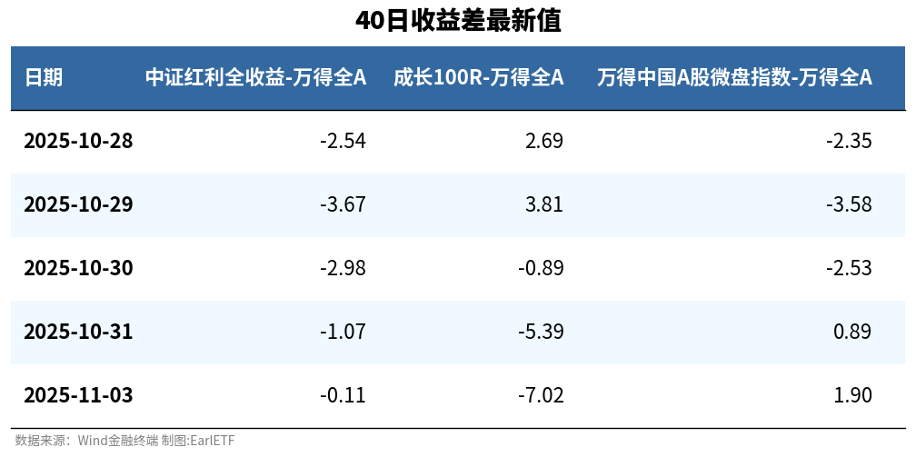 以40日收益差最新值来看,中证红利距离转正还有一步之遥,万得微盘股指数已经达到1.9%,而成长100R则是到了-7.02%,距离我期待的-10%,还有一定的距离。继续蹲。