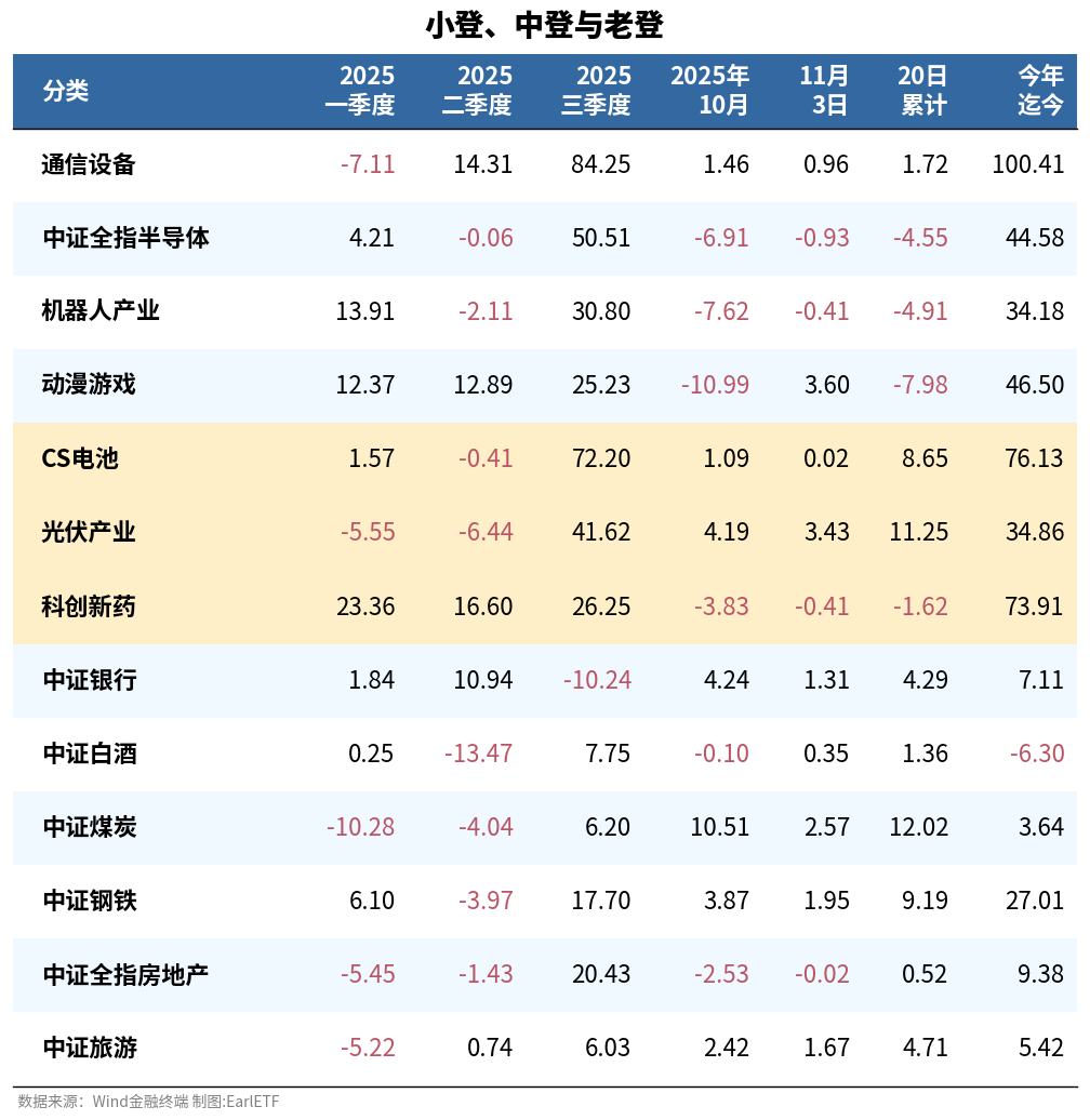 中登行业中,光伏表现抢眼,但以今年迄今表现来看,仍旧显著跑输电池和科创药。而且光伏的上涨,或许还有近期与老登共振“反内卷”的因素。