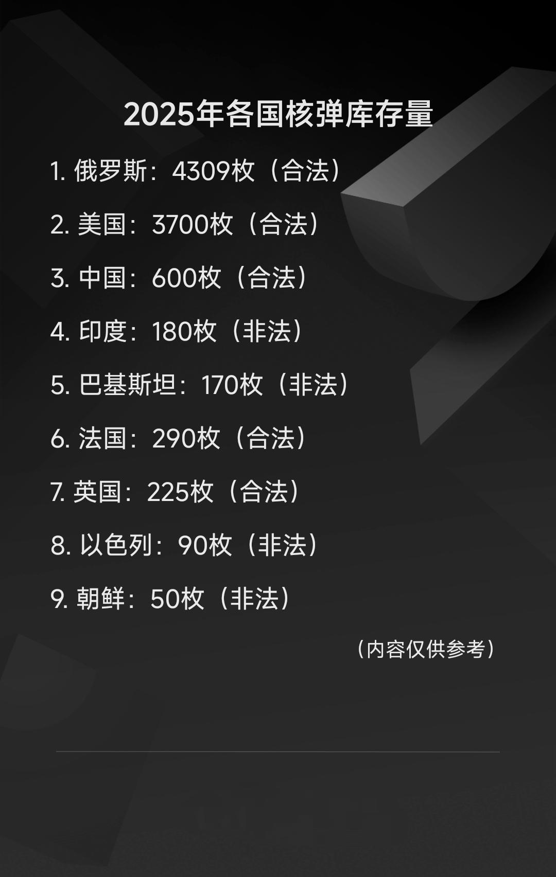 当“白头鹰”说你有某种武器时,你最好真得有,参考叙利亚(美国曾多次以“拥有化学武器”为由空袭叙利亚 )。 11月2日,特朗普在接受美媒采访时声称“中国、俄罗斯、朝鲜都在秘密进行核武器试验,只是秘而不宣” 。 11月3日,外交部发言人毛宁答记者问称,中国始终坚持走和平发展道路,奉行不首先使用核武器的政策,坚持自卫防御的核战略,恪守暂停核试验的承诺。 而目前,根据美国军事观察杂志的核力量评估报告,2025年各国核弹库存量,美国拥有3700枚核弹库存,远超中国。 当你的敌人拥有某种杀伤力武器的时候,你最好也同样拥有。但按照现今的国际环境,会使用到核弹的机率极小,核辐射带来的污染也是人类所不能承担的。 希望各国都能切实遵守《全面禁止核试验条约》的义务和“暂停核试验”的承诺,防止核扩散。 中国核武数量在世界上处于何种水平