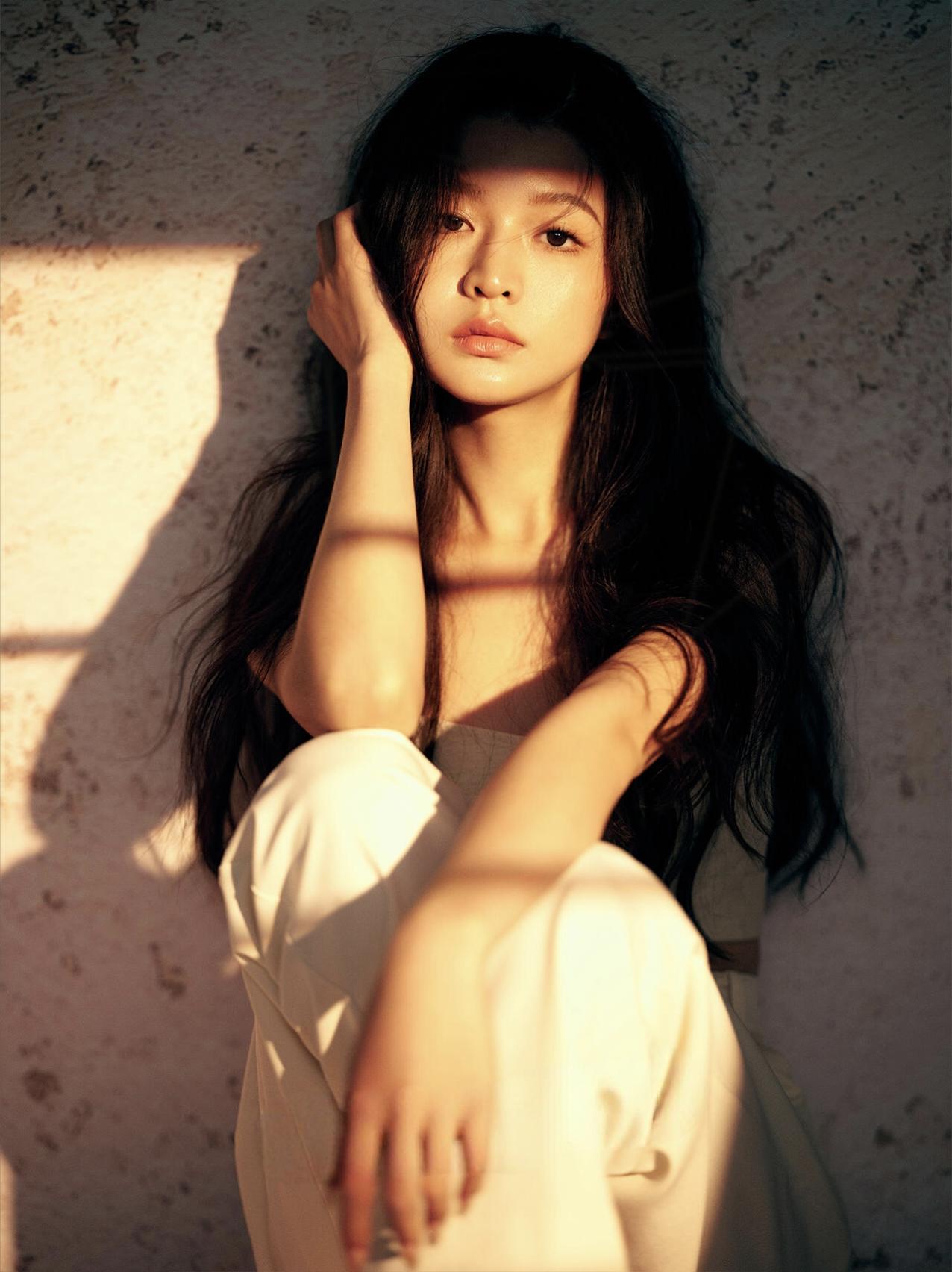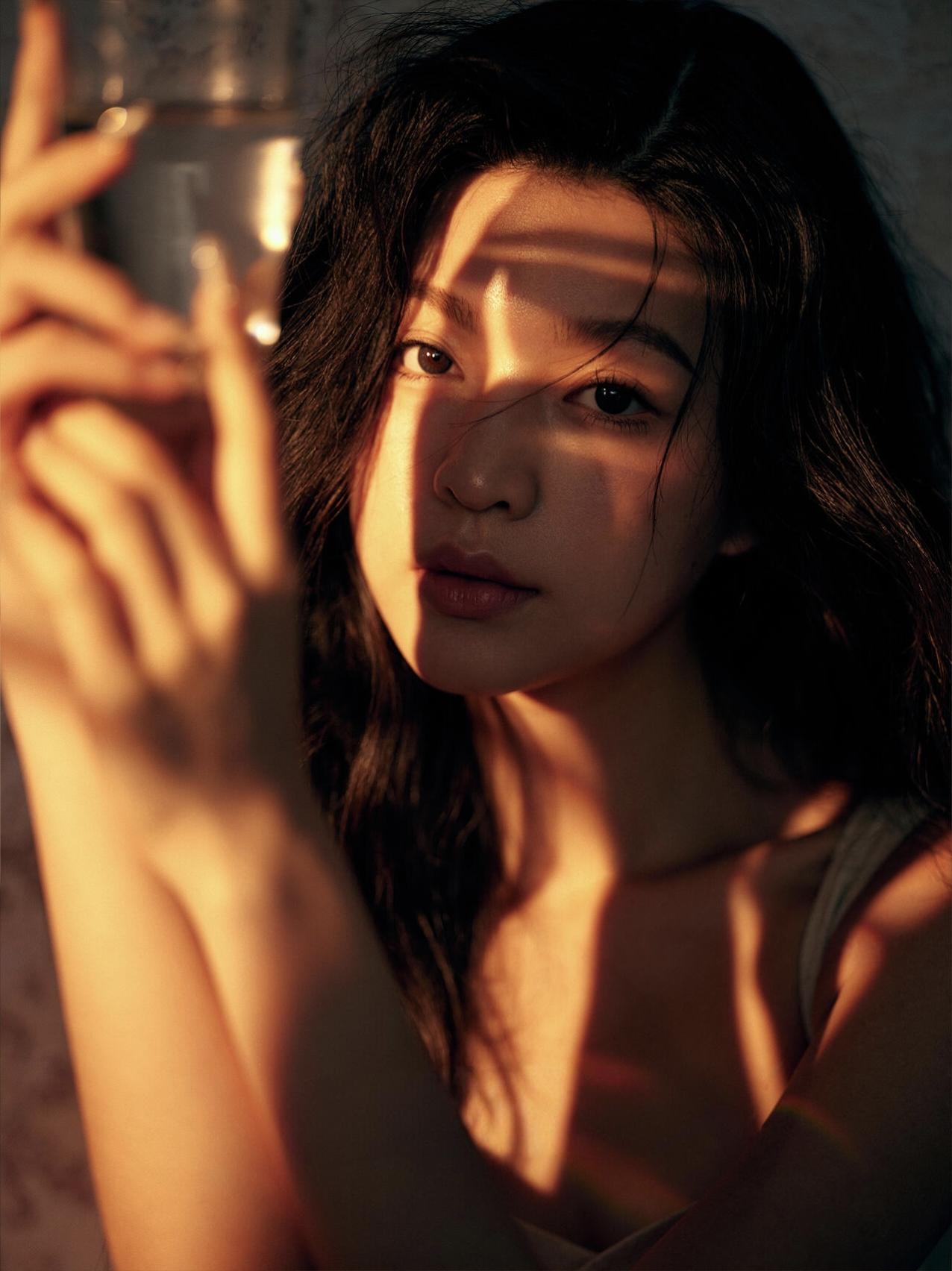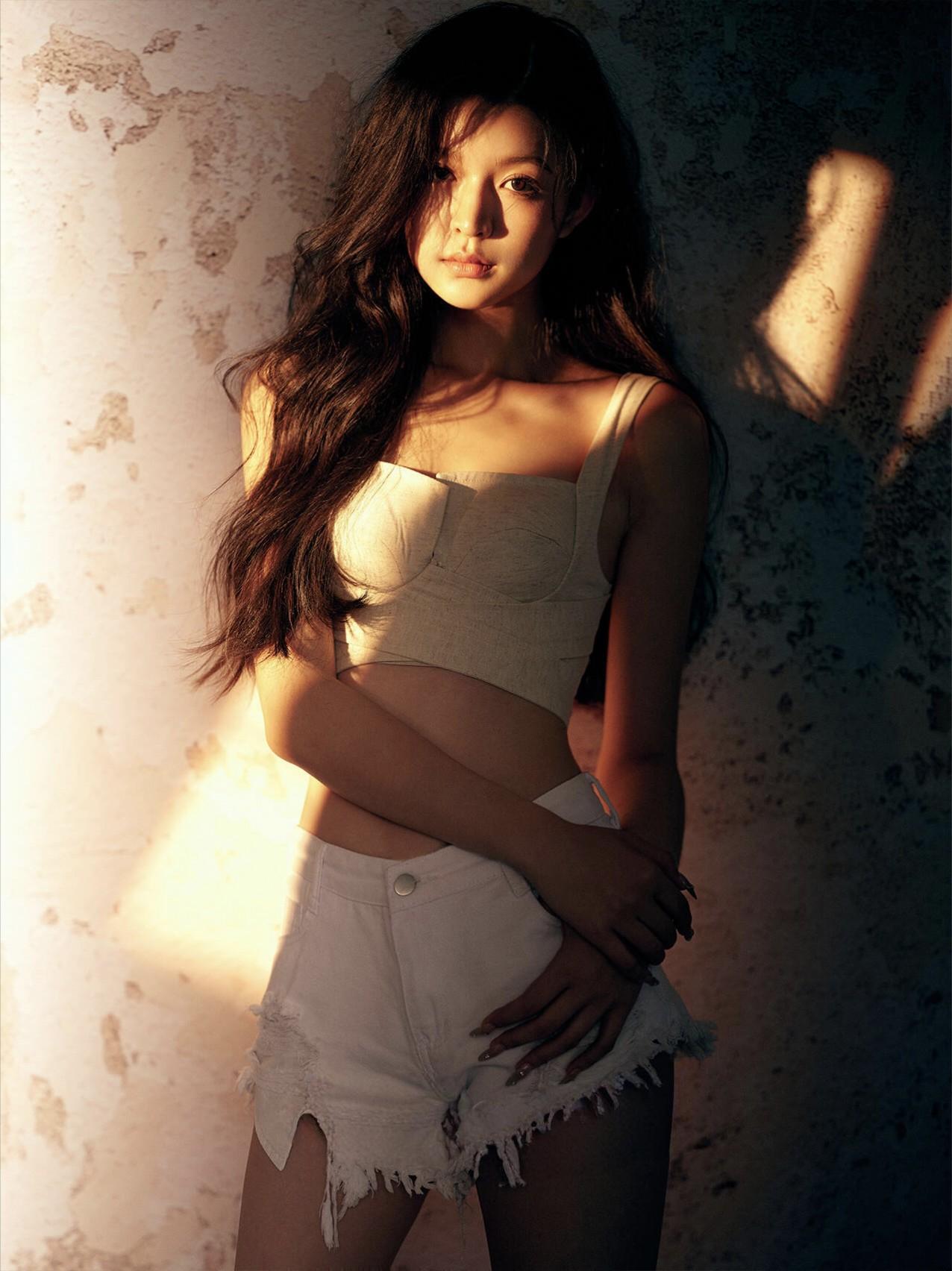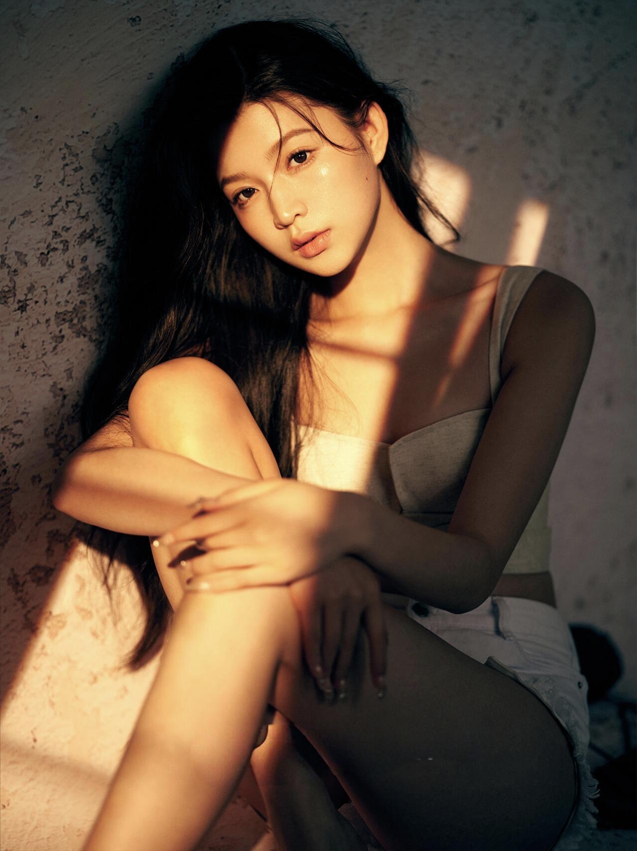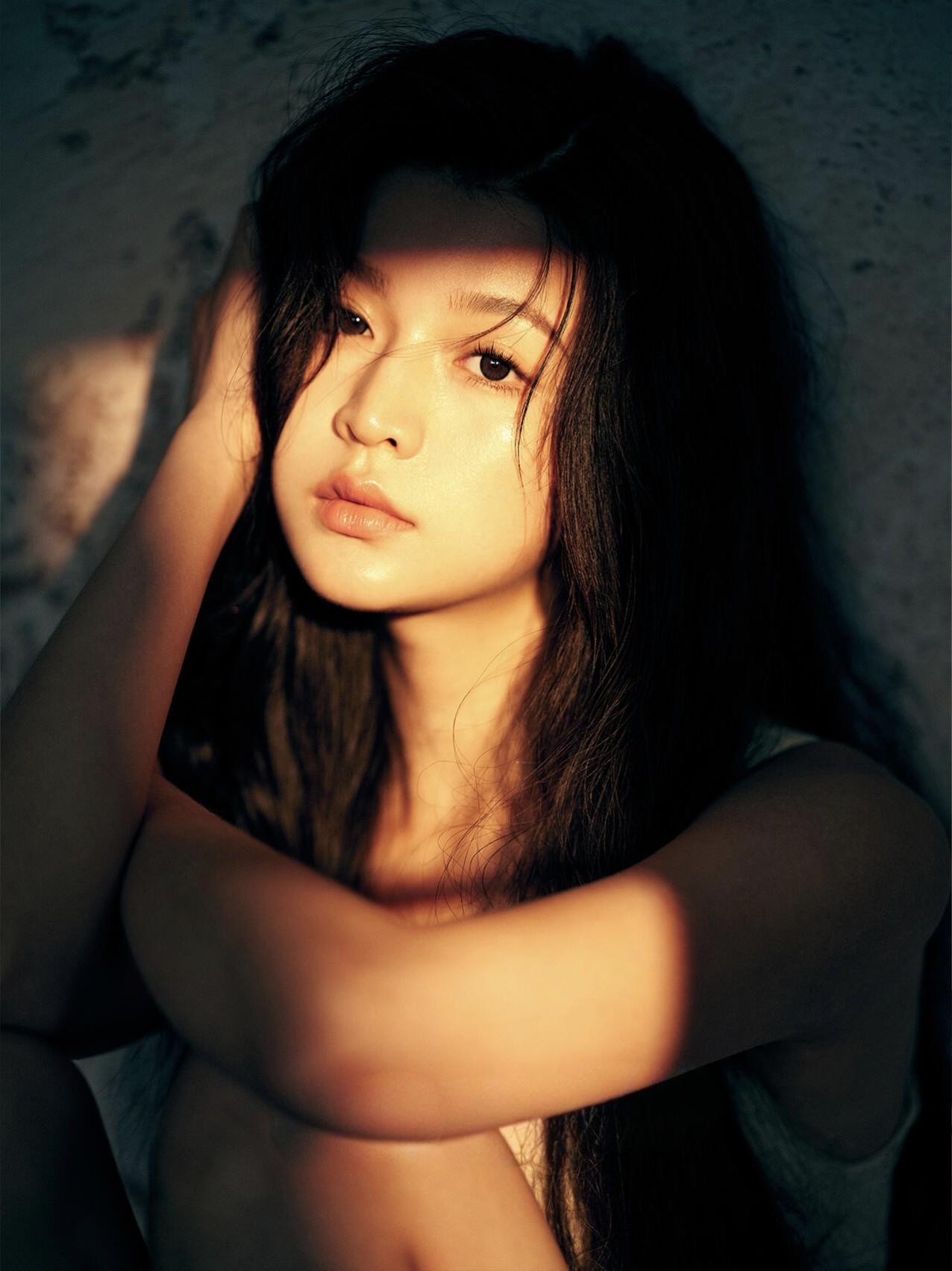 在照片里,光影就是最好的造型师。它给模特的皮肤镀上了一层暖光,让皮肤质感看起来很细腻,同时又用阴影塑造出了身体的线条感。不同的构图里,光影的位置和形状都不一样,有的是斜着切过脸,有的是在身上形成块面,每一种都给人物带来了不同的氛围。 而且光影和模特的互动很有意思,模特的动作好像是顺着光影来的,光影也好像是跟着模特的动作在走,彼此呼应。这种互动就让照片不是冷冰冰的摆拍,而是有了生命力。背景的墙面虽然简单,但粗糙的纹理和光影结合,反而让画面更有质感,不会抢了人物和光影的戏。
