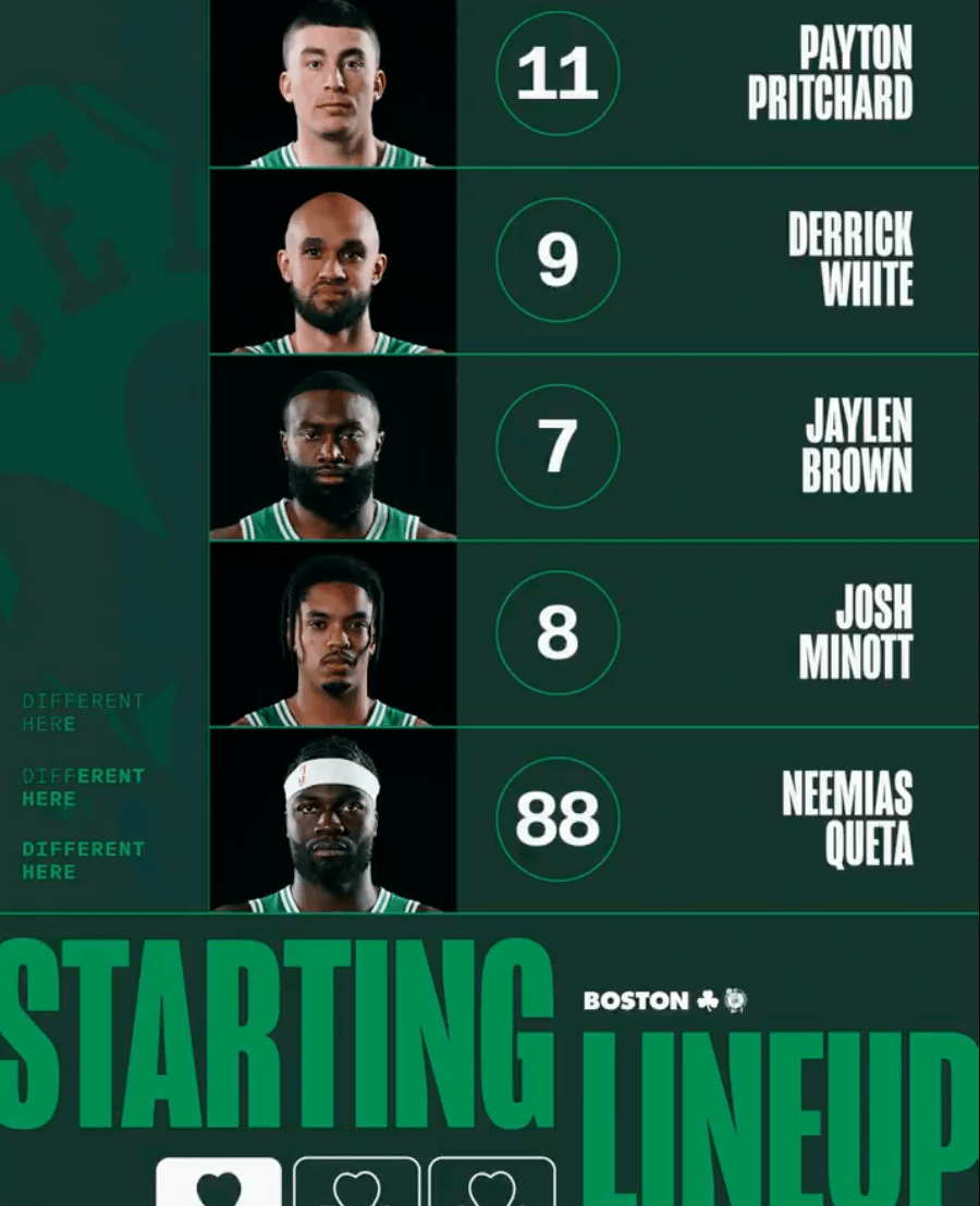 赛前,凯尔特人官方公布球队本场首发阵容:佩顿-普里查德、德里克-怀特、杰伦-布朗、约什-米诺特和内米亚斯-克塔。