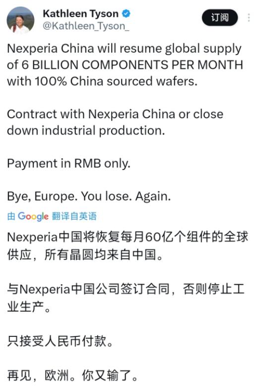 国际金融专家Kathleen Tyson北京时间11月2日发文写道:“安世中国将恢复每月60亿个组件的全球供应,所有芯片均来自中国。与安世中国公司签订合同,否则停止工业生产。只接受人民币付款。再见,欧洲。你又输了。”   这每一个字都往欧洲的痛处扎,估计这会欧洲的车企和荷兰政府心里比谁都慌,之前他们抢安世总部时那股嚣张劲,现在早被现实泼了冷水,凉透了。   荷兰政府九月那波操作多硬气啊,他们打着“国家安全”的幌子,直接冻结了安世147亿人民币的资产,把中方派的CEO赶下台,还强行把股权托管给第三方。当时荷兰政客估计觉得稳了,以为攥住总部就能拿捏全球汽车芯片的命脉。可他们压根没算明白,安世的真家伙早就在中国了。   安世这公司最早是荷兰飞利浦的半导体部门,2019年快破产时被中国闻泰科技花337亿买下。这些年中国团队直接把它盘活了,从行业第11名冲到全球第3,2025年三季度单季净利润就超7亿。   更关键的是安世70%-80%的产能全在中国,东莞基地一年能处理500亿件芯片,全球每10颗车规级功率芯片里,7颗都产自这儿。荷兰抢去的总部,说白了就是个一百来人的行政空壳。   他们更没料到中国的供应链韧性这么强,荷兰总部刚断供晶圆,安世中国就官宣国产化替代早完成了。闻泰在上海自建的12英寸晶圆厂月产能达12万片,早就通过车规级认证。中芯国际、华虹半导体这些国内龙头的产能也完全能跟上,年底前国产晶圆占比都要突破65%了。之前荷兰还想靠断供施压,现在看来纯属自讨没趣。   安世中国十月下旬直接发了通知,宣布恢复每月60亿个组件的供应。但这供应不是无条件的,附带的条件直接掐住了欧洲的脖子。欧洲客户必须签专属协议,协议里明写着“中国子公司拥有最终供货决定权”。这底气来自中国市场的分量,安世中国区收入占全球快一半,2025年三季度汽车业务收入还涨了26%,优先保本土需求太正常了。   更狠的是结算方式,以后所有交易只收人民币。这一下彻底打乱了欧洲企业的节奏,全球半导体行业几十年都用美元结算,现在想拿芯片就得先把钱换成人民币。这步棋不光避开了美元支付系统的风险,更等于在欧洲车企的成本账上捅了一刀。   欧洲车企这会儿快愁疯了,宝马、大众这些巨头,超12%的车载芯片都得从安世拿。安世的芯片是汽车电子系统的“心脏零件”,控制刹车、仪表盘这些关键部位,缺了它生产线就是废铁。   有消息说宝马、大众的芯片库存撑不了四周,博世集团更直言换供应商至少要半年验证。欧盟本身1/3的成熟芯片就依赖中国进口,安世在车规级MOSFET领域还占全球19%的市场份额,根本没法替代。   荷兰政府这时候早就没了当初的嚣张。他们十月下旬让经济大臣给中国商务部打电话,想服软又拉不下脸,连句认错的话都不敢说,最后自然谈崩了。紧接着欧盟也急了,执行副主席专门给北京打了两小时视频电话,以前挂在嘴边的“去风险”硬话全没了,满屏都是“建设性讨论”。   说白了,这场博弈早把真相戳穿了。全球化时代,话语权从来不在空壳总部里,而在产能、供应链和市场手里。中国握着全球八成的芯片封测产能,安世七成的出货量,还有欧洲车企离不开的稀土。荷兰跟着美国搞“脱钩断链”,到头来先把自己架在火上烤。   现在安世中国的生产线开得正欢,芯片全是中国造,钱还得用人民币结。欧洲车企要么签协议换人民币,要么就得停产能。Kathleen Tyson说欧洲“又输了”,这话一点没夸张。荷兰抢总部抢了个寂寞,欧洲车企被掐住命脉,这波操作属实把自己坑惨了。