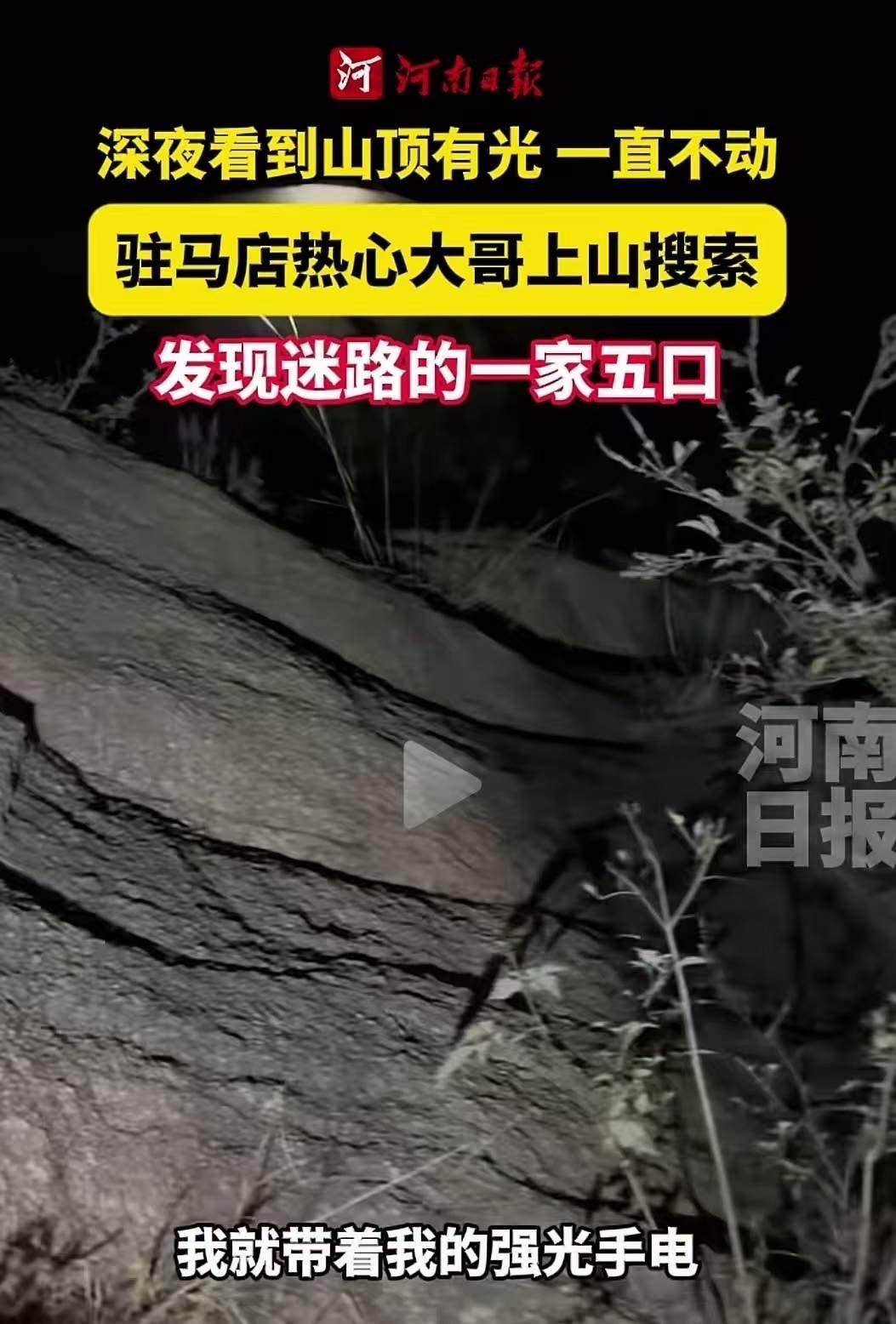 河南驻马店,男子深夜看到山顶有光一直不动,于是上山搜索,结果发现迷路的一家五口!