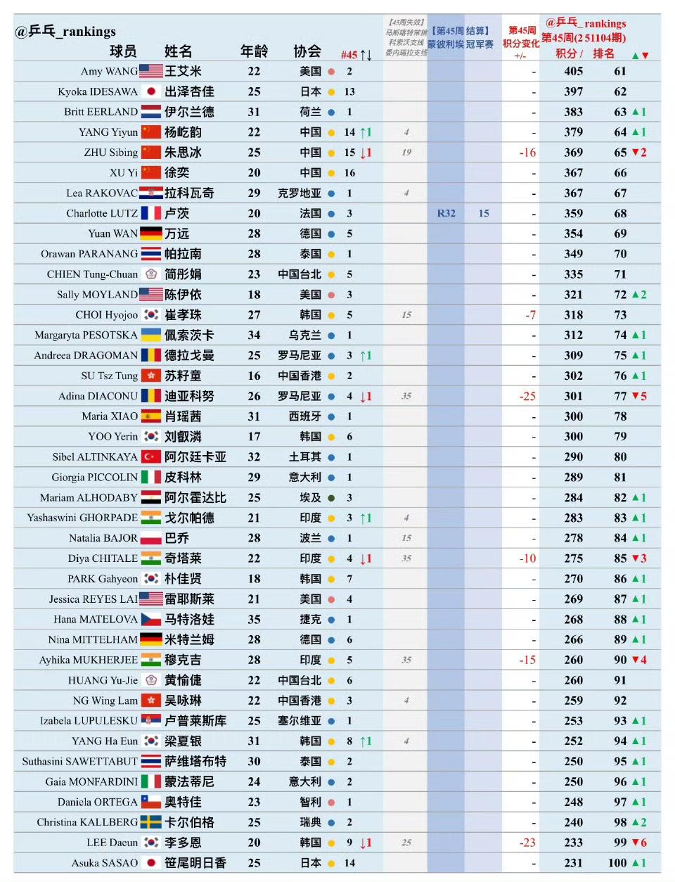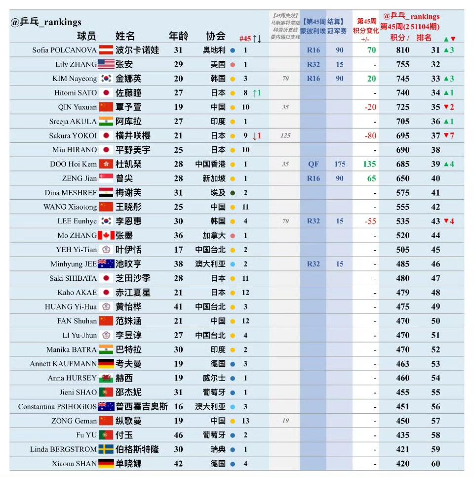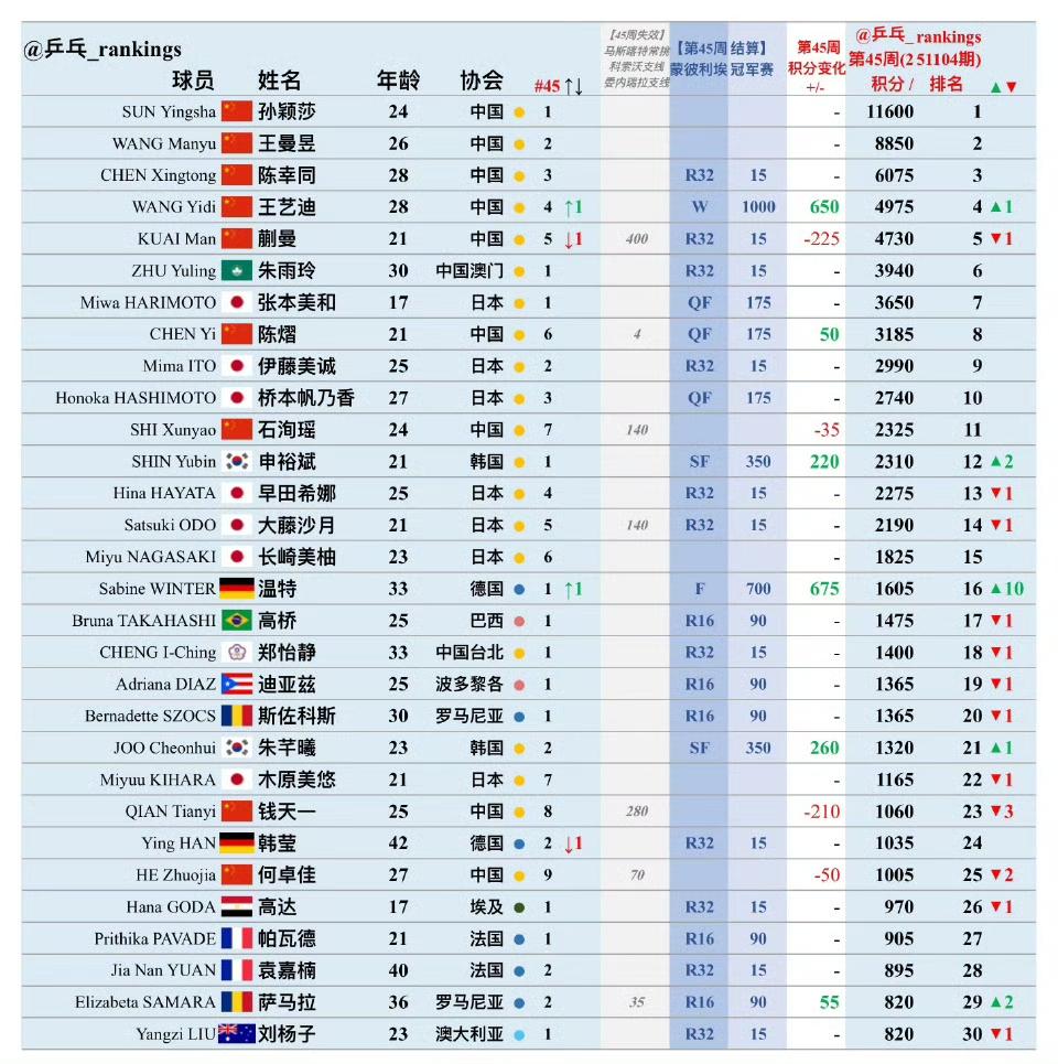 国际乒联第45周女单世界排名! 2025WTT蒙彼利埃冠军赛刚刚结束,由此产生的世界排名积分加上去,而失效的2024WTT马斯喀特常规挑战赛和两个支线赛的积分减掉,新的世界排名如图所示。 国乒选手莎莎、曼昱、同同依然稳定排在前三位,王艺迪暂时重返第四位,蒯曼下降一个位次排在第五位。 但是到了下周,去年的法兰克福冠军赛的积分就要失效,去年获得亚军的大迪将要被扣掉700积分,还会回到第五位。 德国选手温特🇩🇪凭借刚刚结束的蒙彼利埃冠军赛亚军身份,获得700积分,排名上升10个位次,来到了16位,这也是欧洲世界排名最高的女选手。 而雨果🇧🇷的女友高桥布鲁纳🇧🇷排在了第17位,这是出现在排名榜上的第二个非亚洲选手。 斯佐科斯退步了,处在第20位。