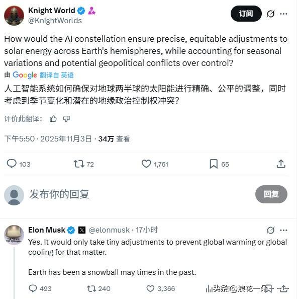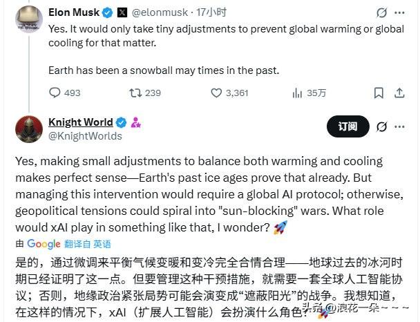 炸裂!炸裂了?🔥 马斯克真是个“外星人”?他脑洞大开啊!他居然要用AI卫星星座来调整太阳能量阻止地球变暖?[捂脸] 你们说他的想法怎么样?能够实现吗?如果可行的话,咱们不是也可以发射几个大星座让东北不再冷?让南方不再变热吗?直接常年保持秋天这个温度多爽啊。 当然了,也有网友质疑,如果要把人工智能星座用在战争上可就麻烦了,这个东西有利有弊。 马斯克的大脑真是不一样,诸葛亮的扇子——远点儿扇着![捂脸]