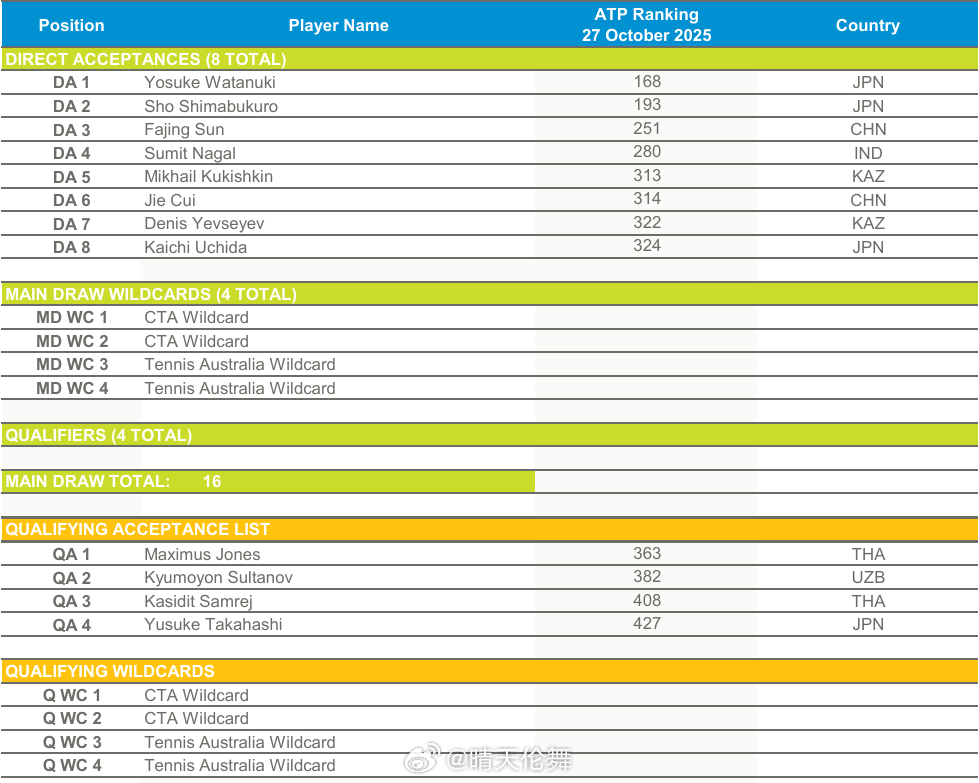 澳网2026 亚太区外卡赛男单名单(11.24)
