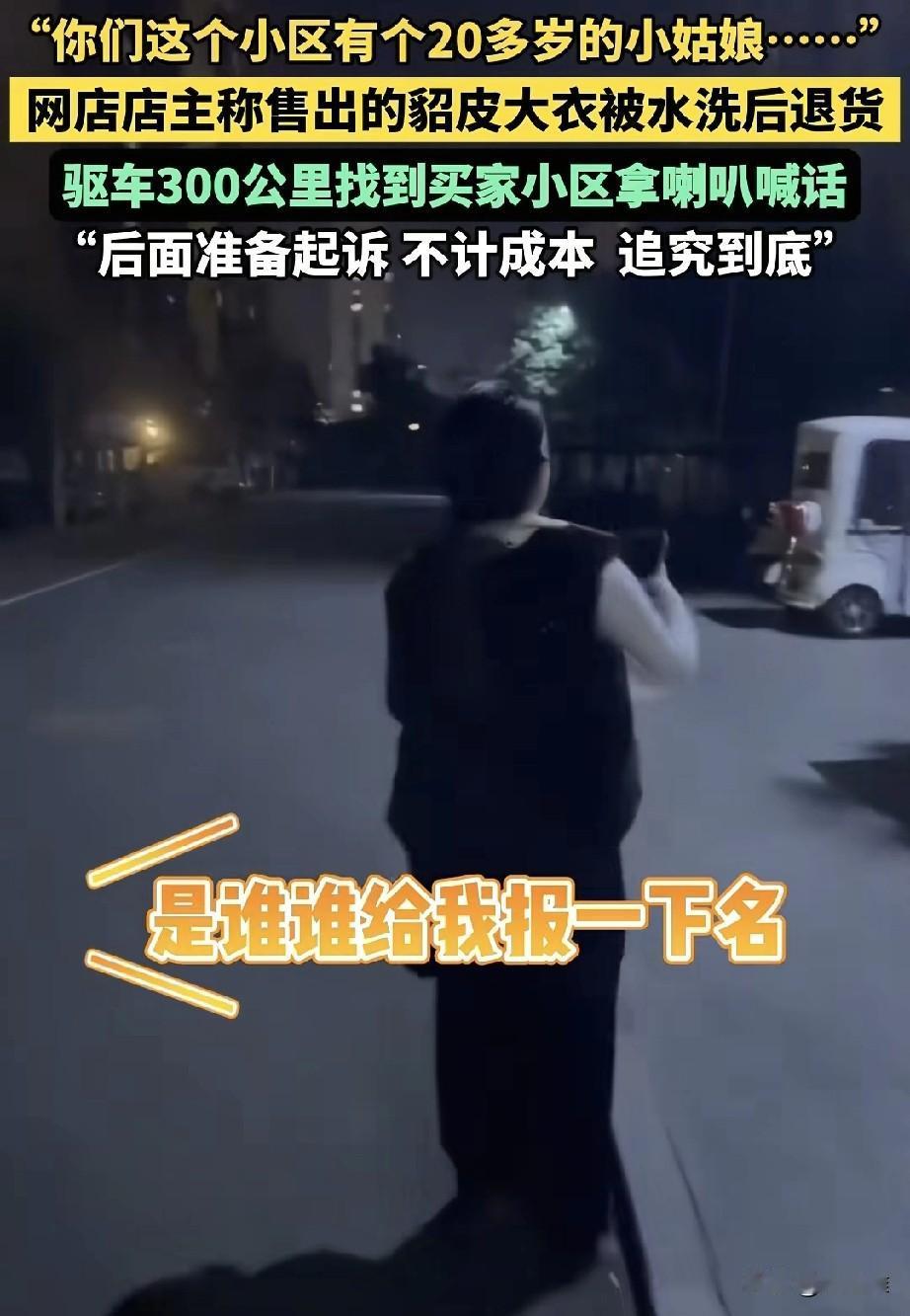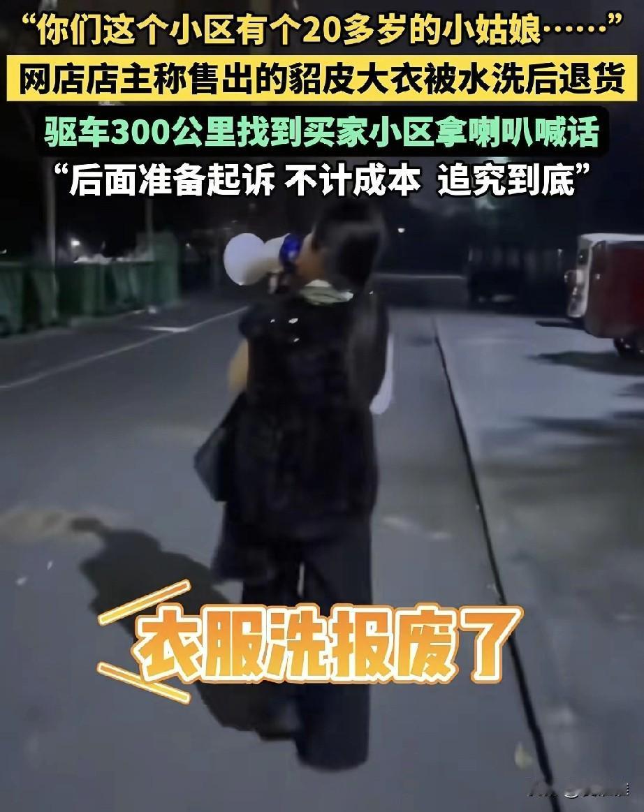 女子开网店售卖貂皮大衣,被一个20多岁的女生水洗后恶意退货,女店主气不过,开车300多公里,根据快递上的地址找到女生所在的小区,拿着喇叭吆喝:“你们这个小区的一个20多岁的小姑娘,是谁家的孩子,从我的网店里买了件貂皮大衣,用水洗之后又给我退回来,影响二次销售真是太缺德了。”女店主直至离开这位20多岁的女生始终没有露面!店主表示:“一定要不计成本的找到她,追究她的责任。” 不得不说店家干的好,虽然我是买家,但是这种缺德买家,太欺负人了。但凡有点良心也干不出这种事,这事我站卖家一边