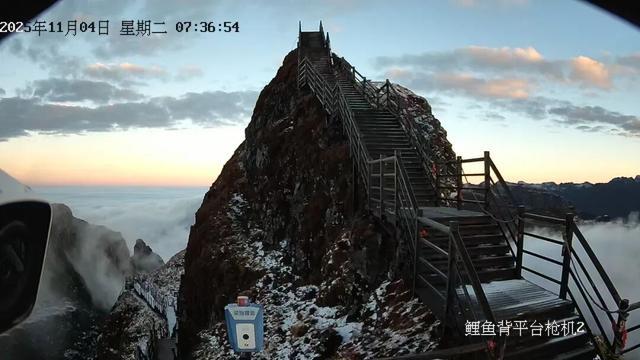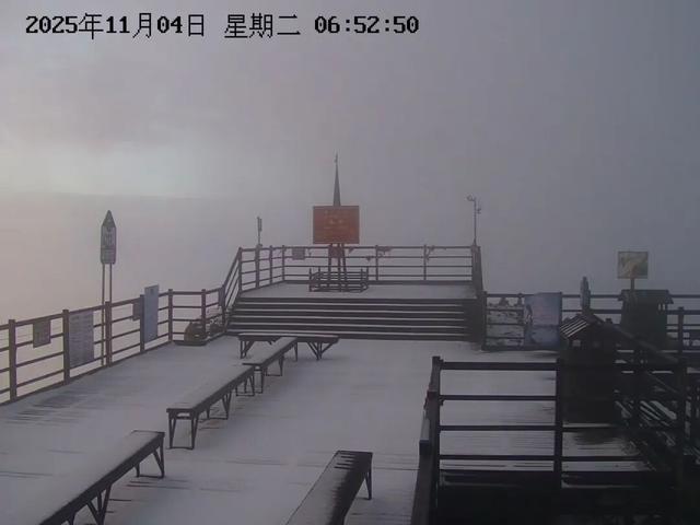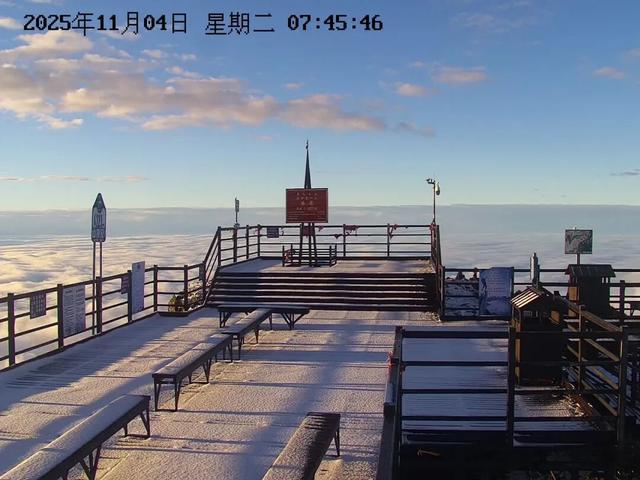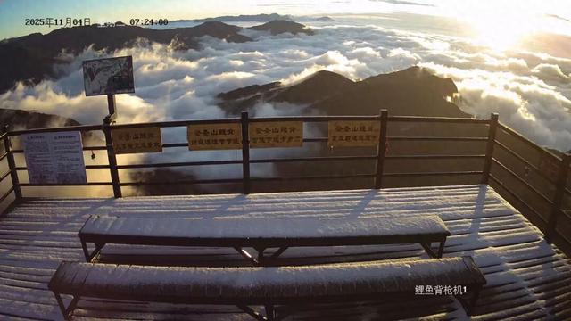 据景区视频显示,降雪过后,轿顶观景台等地已覆盖上一层薄薄的白色积雪,山色空濛,景致别样。至11月4日清晨7时许,轿顶区域在持续低温下,首场积雪得以保留。此时,天际泛起金色霞光,与翻涌的云海、洁白的积雪交相辉映,形成“晨光、云海、冰雪”同框的难得景象。