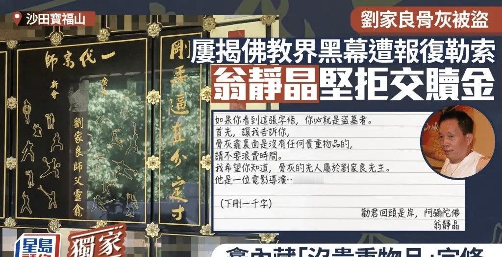 真没想到会发生这种事,太缺德了!连已故武术大师刘家良的骨灰都有人偷,还勒索几千万,这简直毫无底线。 他妻子翁静晶很刚,坚决不交赎金,不然只会助长这帮人。希望警方能赶紧把骨灰找回来,让刘师傅能安息。