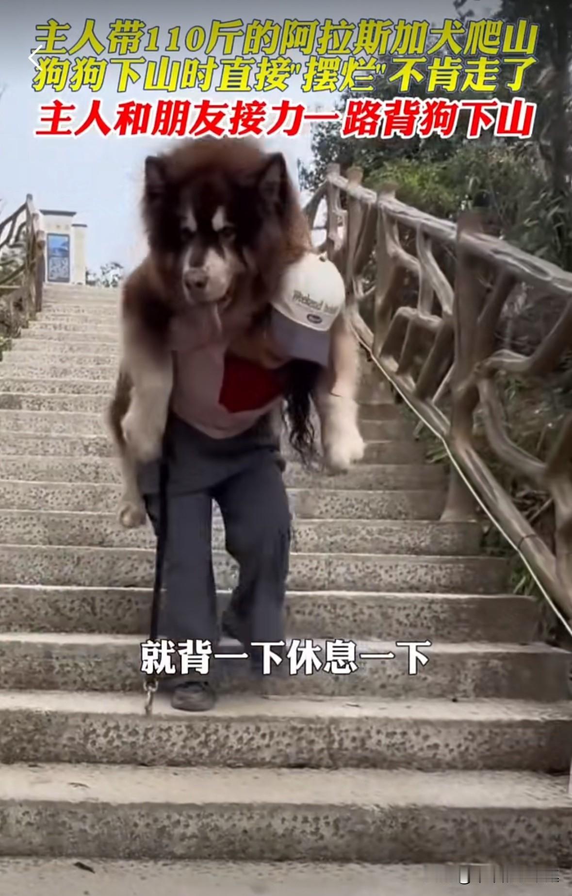 女子带着狗去爬山,上山的时候托着它屁股,下山时“摆烂”不肯走了。 女子说:“凯撒今年四岁了,有110斤,下山的时候,因为它脚上磨出水泡了,所以不肯走了!” 女子只能和朋友轮流背着狗,走一会歇一会! 去爬山还带着狗,你真是活受罪啊。 不过这只狗真大!阿拉斯加