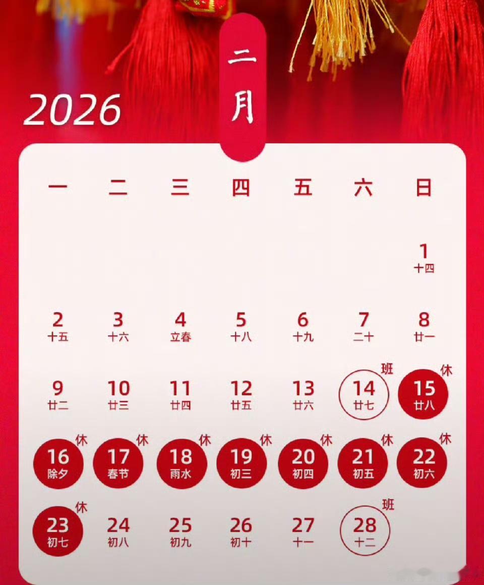 2026春节放9天假,如果没有调休就好了,从15放到23,其中有3天是周末,2天是调休,最后实打实放的假只有4天。 来回出行折腾一趟就得花费将近两三天,最后在家凳子还没捂着就可以收拾收拾出门,尤其是我这种出门在外工作的人,每年春节一大半时间在赶路,真正待在家里没几天。