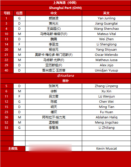 虎扑11月04日讯北京时间今晚20:15,亚冠精英联赛第4轮比赛,上海海港将客场对战武里南联。赛前,双方公布了本场比赛首发名单。