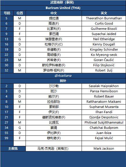 武里南联替补:34-察猜、2-沙沙勒、3-班沙、4-鲍尔、8-拉他那功、10-紊帕那、17-伊汉、21-德斯波托维奇、27-比提瓦、55-伊比萨、99-穆利奇