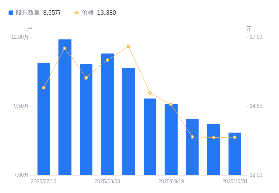 日期A股户数(户)流通A股户均持股数(股)户均持股市值(万元)2025-10-31854845376.587.192025-10-20886605183.986.932025-09-30905965073.206.792025-09-19957864798.326.992025-09-10978534696.967.042025-08-201089164219.877.042025-08-081142124024.206.512025-07-311102524168.746.482025-07-181193923849.606.392025-07-101106924152.176.30