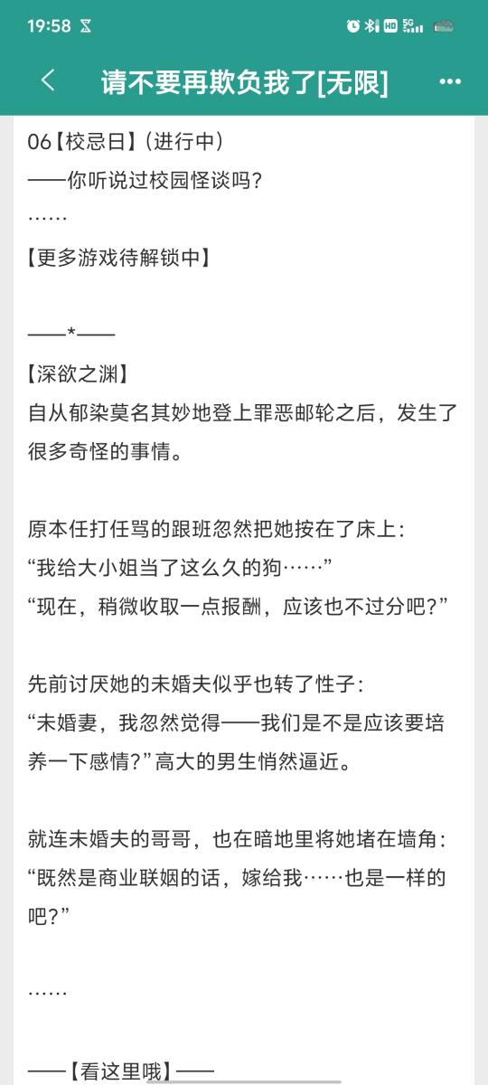 女主面前有两个男人,系统告诉女主。在这个世界他是一个有钱人家的大小姐,和未婚夫一起来到游轮上。一个是船上的服务生正在被他欺负,另一个是她的随行人员。俩人似乎都对女主有好感。还有一个重要的角色是女主的未婚夫,两人是商业联姻,没有什么感情。后续未婚夫也会为了女主痴狂。