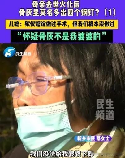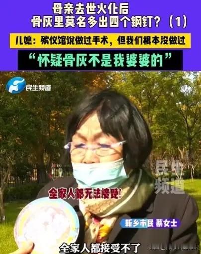 河南一90岁老人因病去世,家人将其火化后,骨灰里竟然莫名多出4个钢钉?殡仪馆说做过手术,但这说法让老人家属不能接受,因为老人根本没做过手术,医院也出示了证明,老人无手术史!儿媳说全家都怀疑:这骨灰根本不是我婆婆的! 那天,蔡阿姨和丈夫办完手续,在殡仪馆外等了四十多分钟,工作人员通知他们去领骨灰,心里还想着赶紧把婆婆的骨灰拿去和公公合葬。 可走到跟前一看,灰白色的骨灰里,赫然躺着四根锈迹斑斑的钢钉,每根都有拇指那么长,小拇指那么粗。蔡阿姨照顾卧病在床的婆婆好几年,洗澡擦身,从来没在老人身上看到过任何手术疤痕,更别说腰上动过那么大的刀子了。 家里还留着婆婆生前在医院做的CT检查报告,上面白纸黑字写着“体内未见金属异物”。这四根钢钉,就像是凭空变出来的一样。 一家人赶紧去找殡仪馆,工作人员倒是很淡定,指着监控说流程肯定没问题,一个炉子一次只火化一位逝者,还铺着新垫子,绝对不会搞混。他们解释说,钢钉出现在腰椎部位,说明老人生前肯定做过手术,家属可能不知情。 家属仔细查看录像,发现火化刚结束、骨灰被推进发放处的那段关键时间,监控画面突然断掉了两分多钟。偏偏就在这两分多钟里,骨灰中莫名其妙多了四个钢钉。对于监控为什么偏偏在那时中断,殡仪馆的解释是“线路老化”。 蔡阿姨一家最大的心结是要把婆婆和公公合葬,如果这骨灰不是婆婆的,那岂不是天大的误会?现在这包骨灰他们不敢认领,更别说让老人入土为安了。 目前有关部门已经介入调查,如果真要走司法程序,有两个钢钉上还连着一小截没烧化的骨头,或许可以通过DNA鉴定,弄清楚这骨头到底是不是蔡阿姨婆婆的。 一个从没做过手术的老人,火化后骨灰里多出四个钢钉,监控又在最关键的时刻缺失。这件事不仅仅是一家人的困惑,也是公众的困惑。 各位读者你们怎么看?欢迎在评论区讨论。