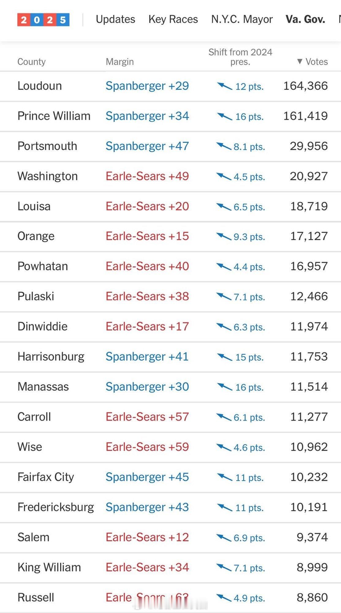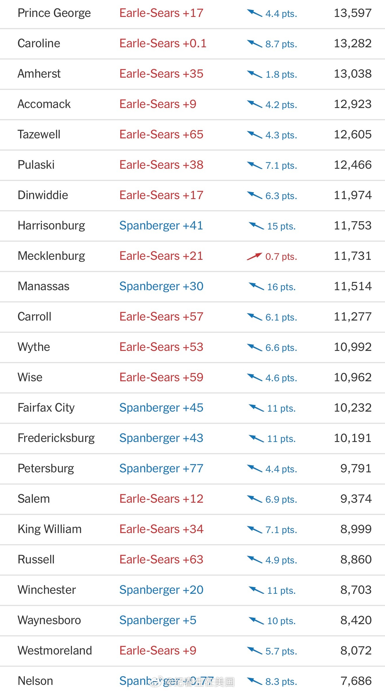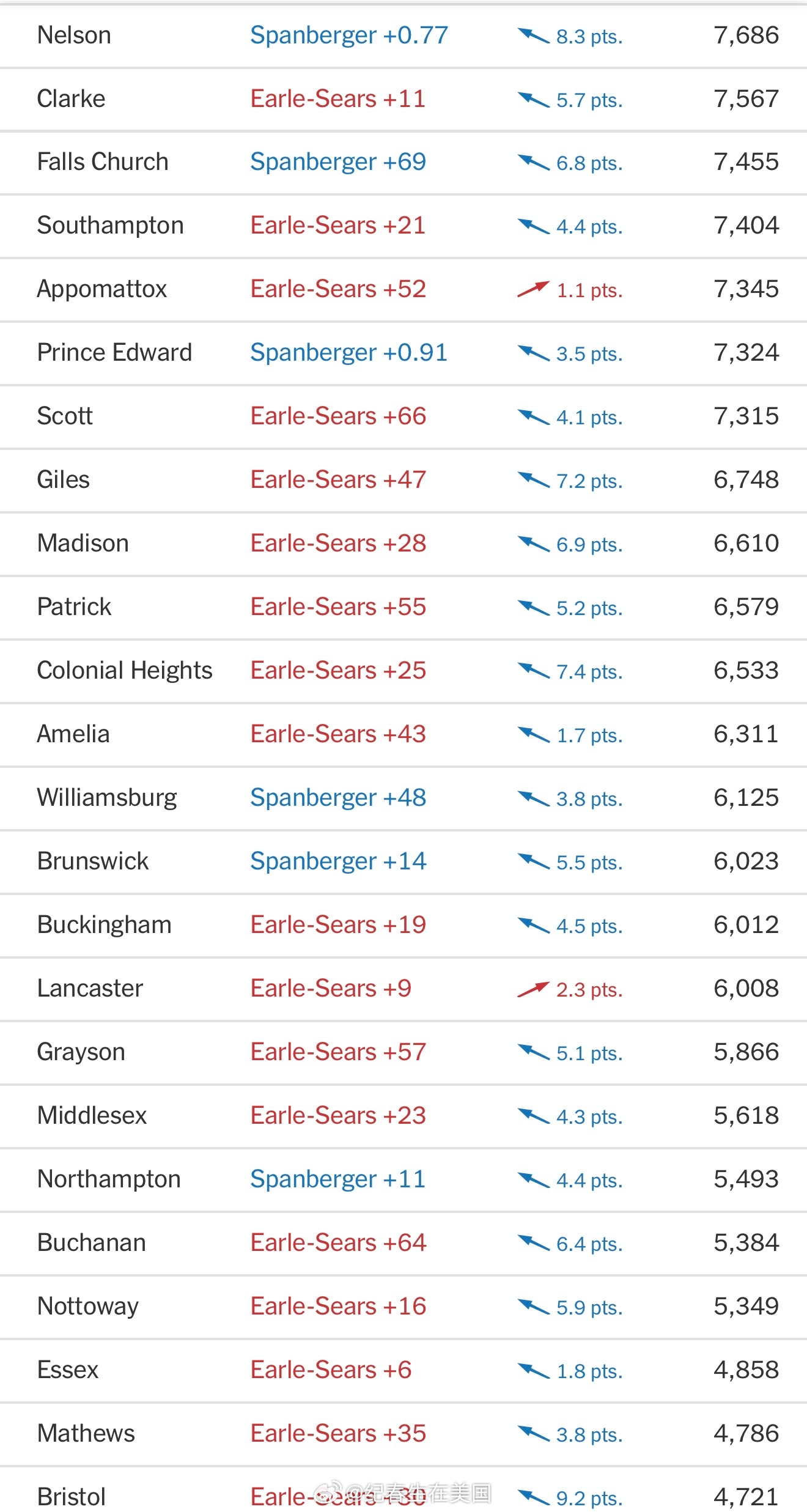 弗吉尼亚州长选举中,相比2024大选,几乎每个郡都向民主党偏移。热点现场今日焦点