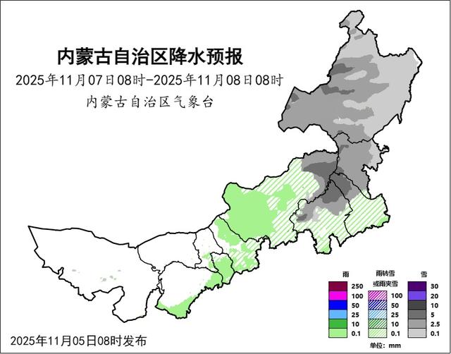7日08时至8日08时,西部偏南、中东部大部地区多云,有小雨、雨夹雪或小雪,其中,锡林郭勒盟东北部、赤峰市北部、通辽市西北部、兴安盟中部和西部、呼伦贝尔市西部和南部有中雪或雨夹雪,局地有大雪;中西部大部、东北部地区4、5级短时6、7级西北风或偏南风;中西部大部和东北部偏东地区气温下降4到6℃,局部地区气温下降6到8℃。