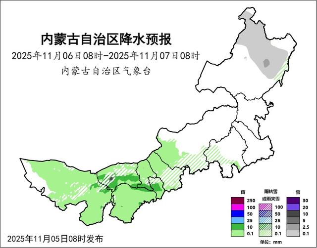 06日08时至07日08时,西部、中部偏西和偏南、东南部偏西和东北部偏北地区多云,有小雨、雨夹雪或小雪,其中,阿拉善盟东北部、巴彦淖尔市西部和南部、鄂尔多斯市北部偏北、包头市南部、呼和浩特市中部、呼伦贝尔市东南部部分地区有中雨、雨夹雪或中雪,局部地区有大雨或大雪;中西部大部地区4、5级短时6、7级西北风或偏南风;西部偏西和东北部地区气温下降4到6℃,局部地区气温下降8℃以上。