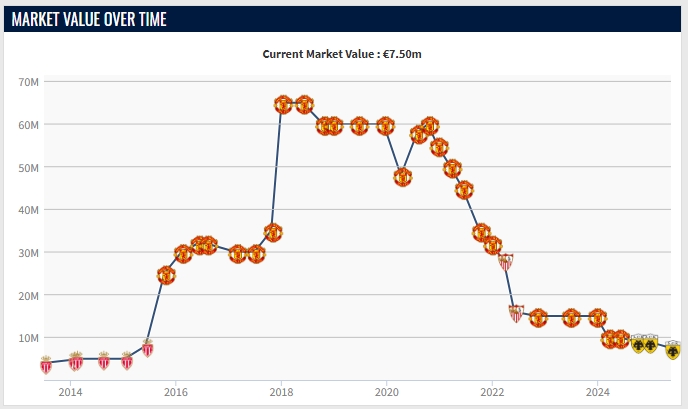 在2015年,19岁的马夏尔曾以6000万欧元转会费加盟曼联,并在当年获得欧洲金童奖。在2018年,马夏尔的德转身价达到生涯巅峰,高达6500万欧元。如今29岁的马夏尔已远离五大联赛,身价仅剩750万欧。