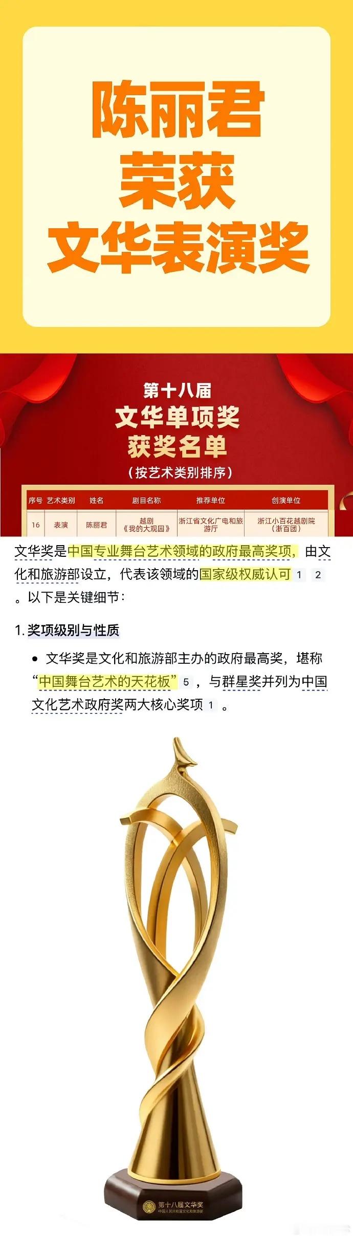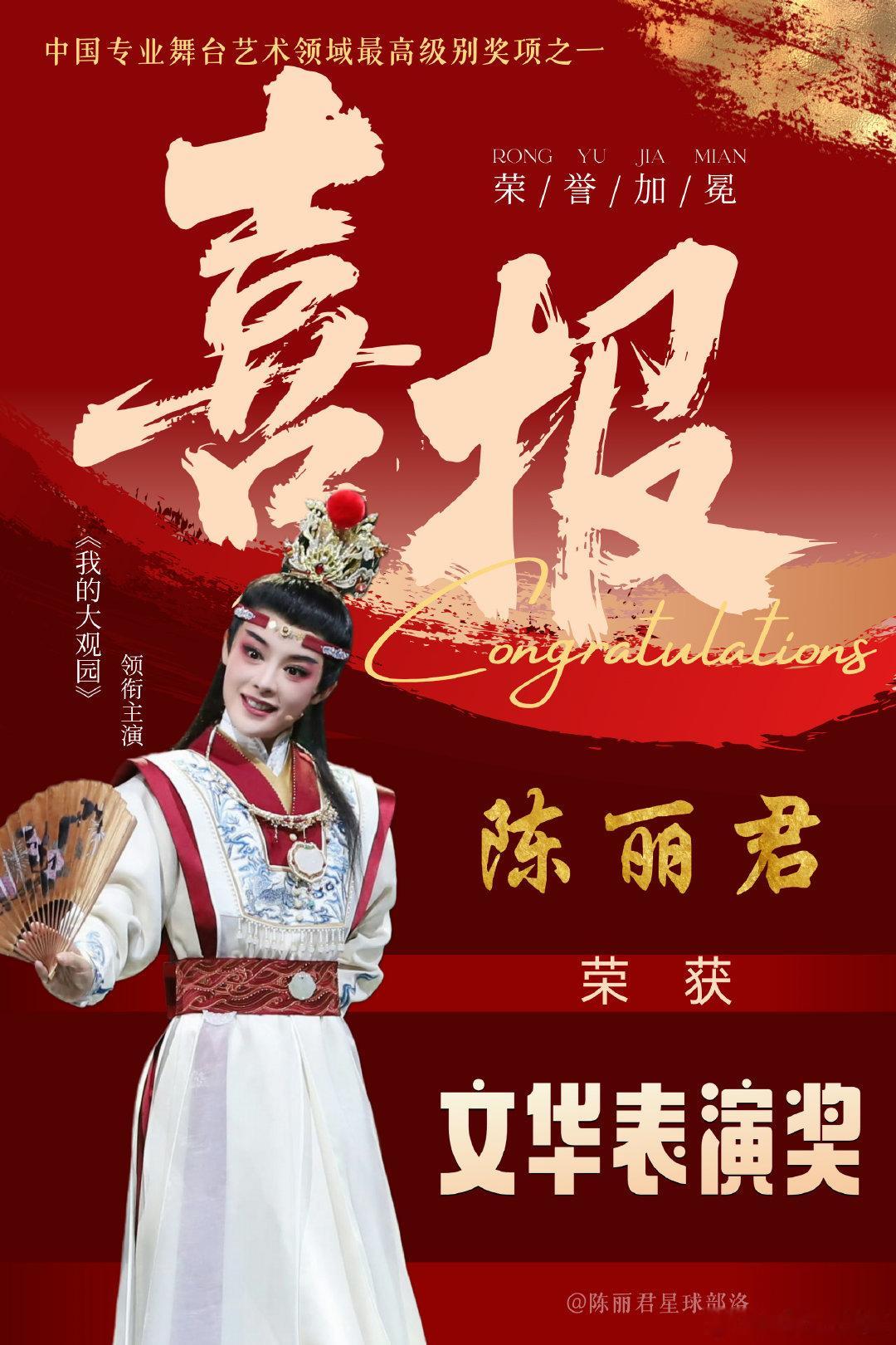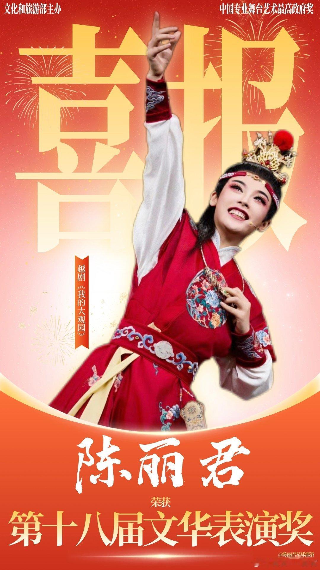 恭喜陈丽君荣获第十八届文华奖—文华表演奖,成为首位获得该国家级奖项90后越剧演员,文华奖为中国专业舞台艺术政府最高奖,此外,陈丽君还是近三届文华表演奖唯一越剧演员,君君太优秀了,前途不可限量[开学季][开学季][开学季]