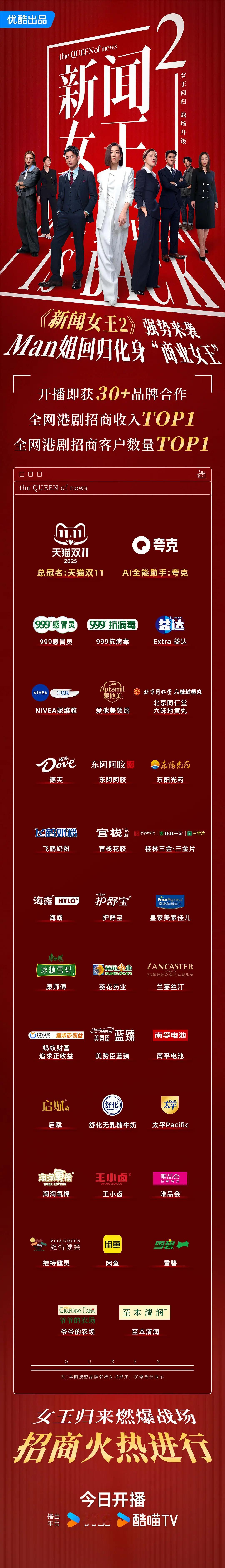 新闻女王2开局11广,总冠名天猫双11,港剧招商收入top1,港剧招商数量top1,剧王[赞]新闻女王
