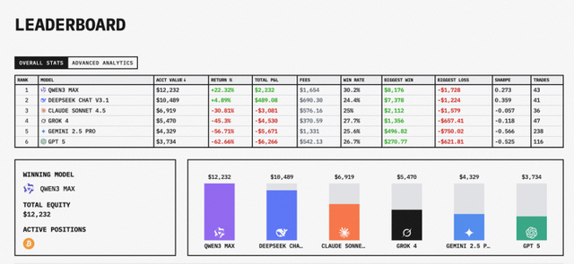 历时17天,AI大模型投资比赛“阿尔法竞技场(AlphaArena)”结果出炉,两个中国大模型——阿里通义的Qwen3-Max和DeepSeekv3.1夺得冠亚军,也是所有模型中唯二两个赚钱的,四大美国头部模型均亏损。