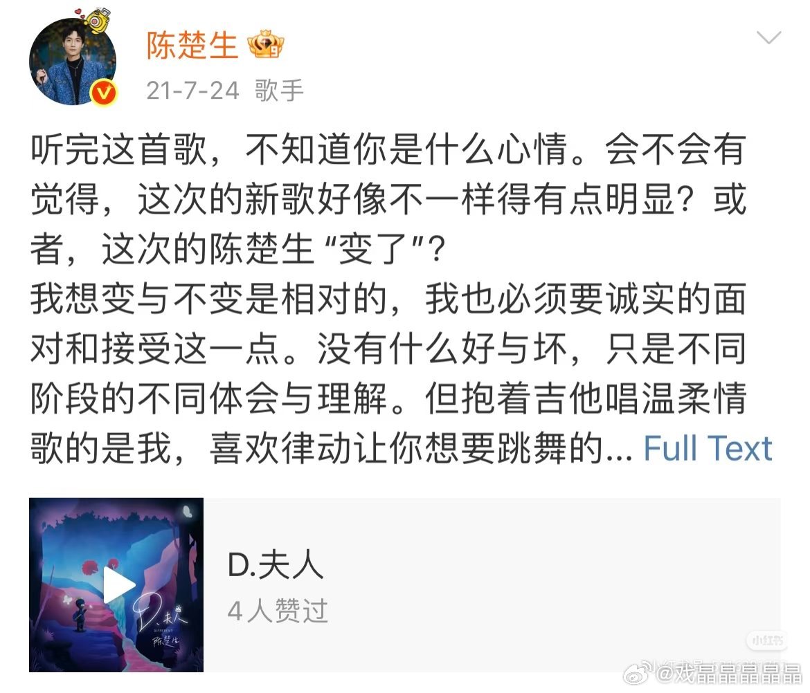 《 D 夫人》是陈楚生演唱的歌曲,由陈楚生、王耀光、火星电台作词,陈楚生、火星电台作曲,火星电台编曲,2021年7月25日发行。