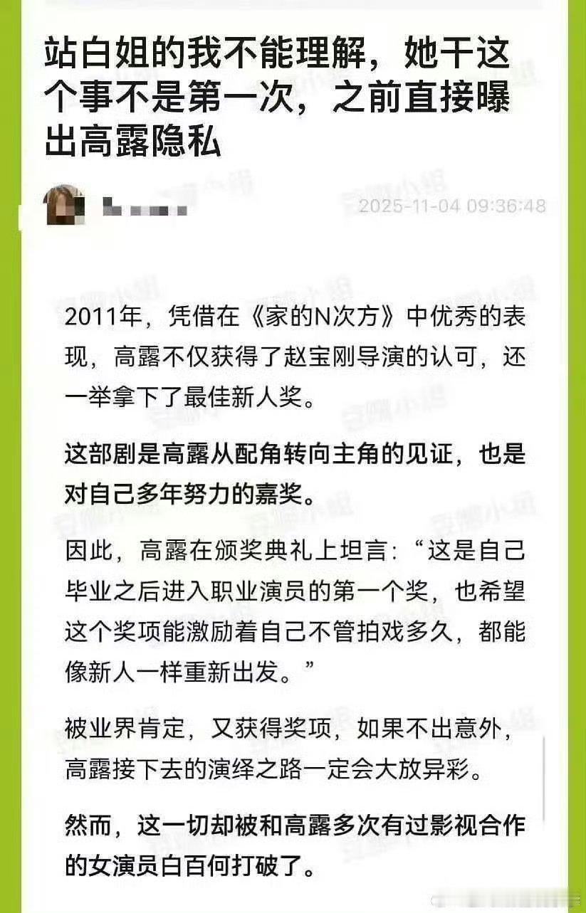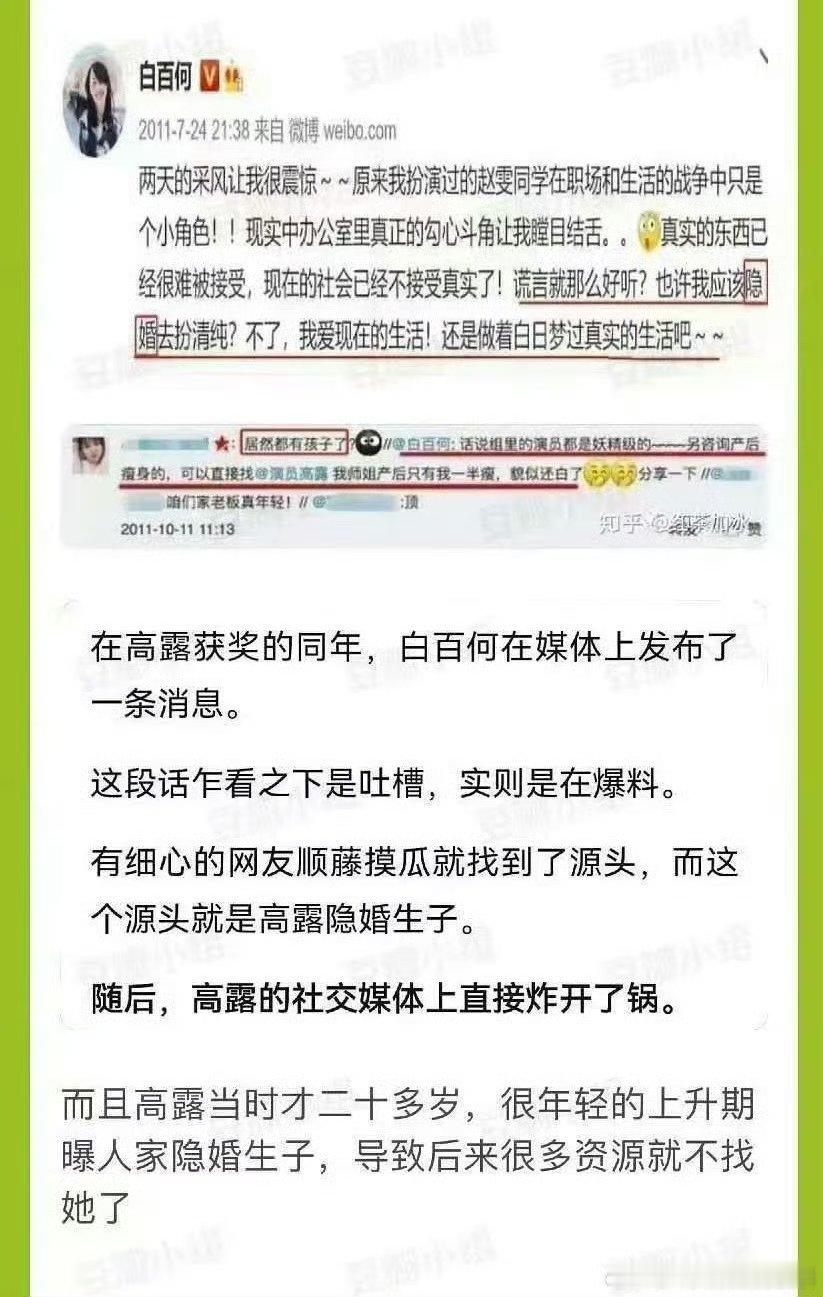 突然想起以前《家的n次方》那阵,高露拿奖之后,白百何也是直接在微博爆了高露隐婚生子的料,当时刷到都惊得我手机差点掉了!还有她和WLD,俩人互内涵的戏码真的看了好多年,记得17年她被拍负面那阵,WLD不还在朋友圈发“春天来了”嘛…现在想起来还是觉得好抓马!