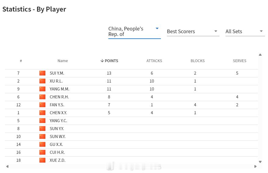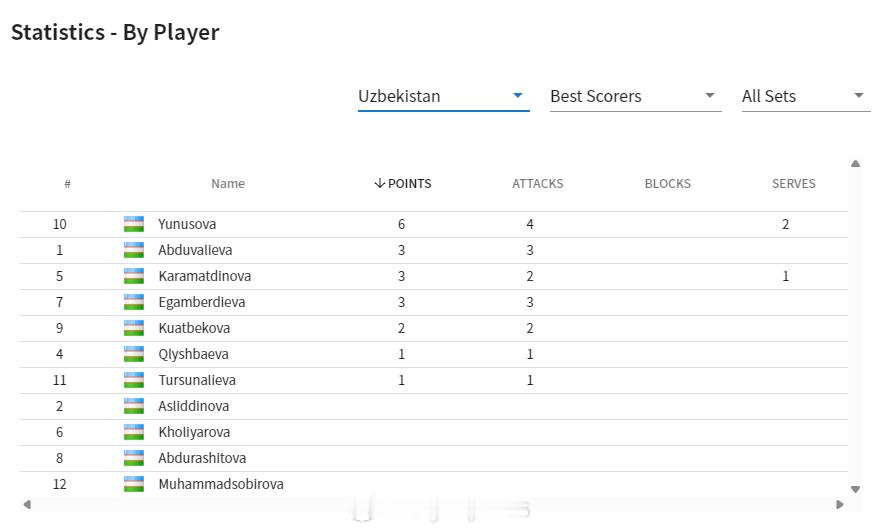 【U16女排亚锦赛中国3-0乌兹别克技术统计】国际排坛战报速递 11月5日约旦安曼,U16女排亚锦赛八强复赛,中国队首战3-0(25-9/25-11/25-8)横扫乌兹别克斯坦。扣球35-16、拦网9-0、发球11-3、对方失误送分20-9。隋依妙13分(13扣6中2拦5发)、徐睿琳11分(13扣10中1拦)、杨淼淼11分(22扣10中1拦)、陈睿菡8分(14扣4中4发)、范元晟7分(2扣1中4拦2发)、陈馨怡5分(7扣4中1拦)。
