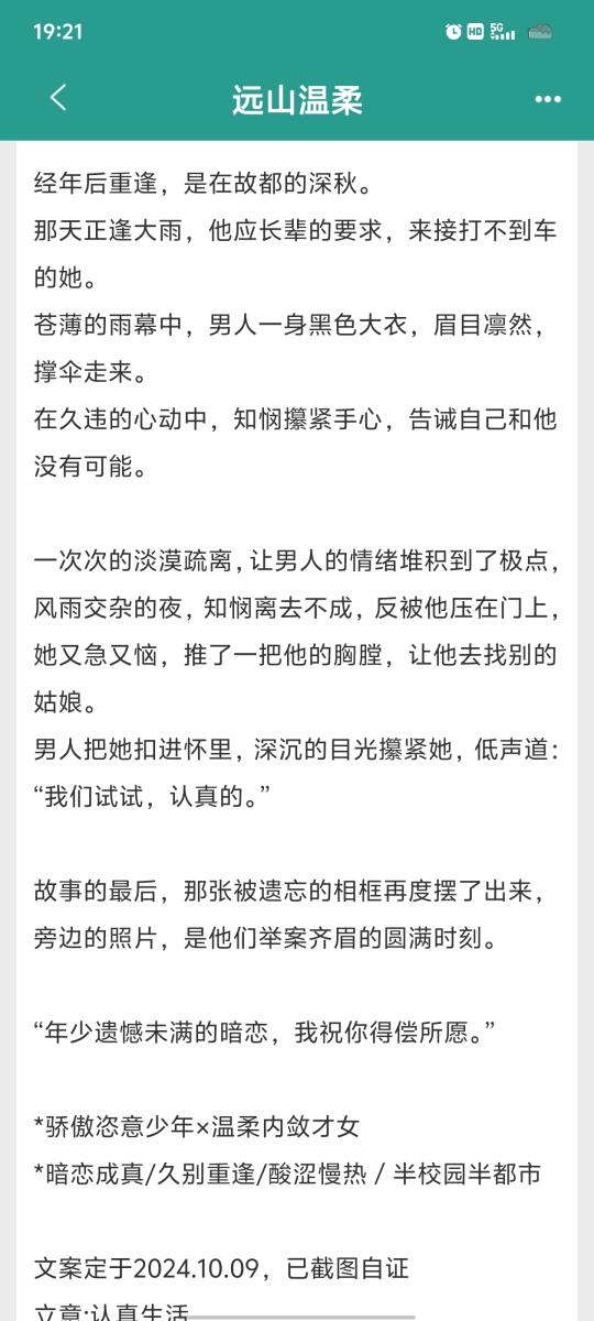 i这篇半校园半都市文太绝了!阔别多年仍旧会心动! 骄傲恣意少年×温柔内敛才女 文名:《远山温柔》 天之骄子的男主遇上温软坚定的女主,心动还是在响,只是你的身边总有别人!太酸涩了! 多年后久别重逢!男主“追妻火葬场”,女主暗恋成真!好甜好甜!速去看~
