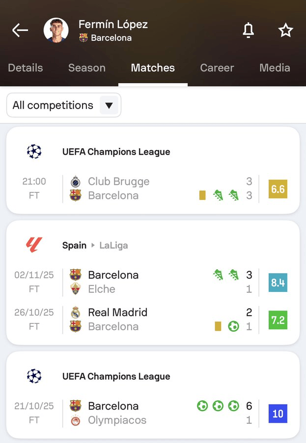 虎扑11月06日讯欧冠联赛阶段,巴塞罗那客场3-3战平布鲁日,费尔明-洛佩斯在比赛中送出2次助攻。