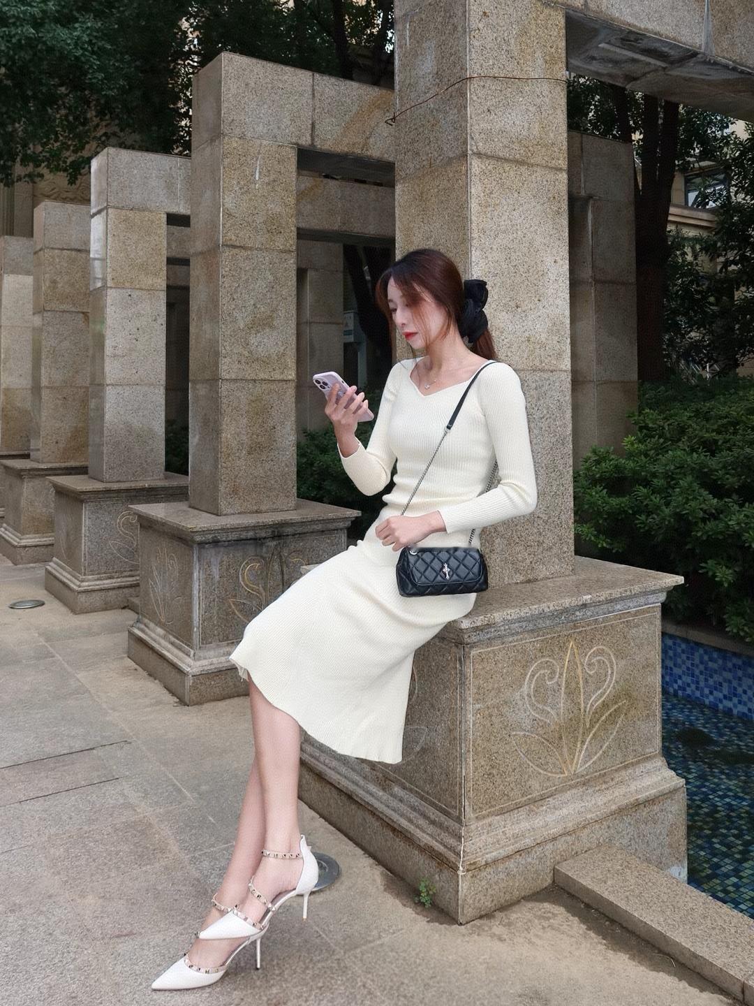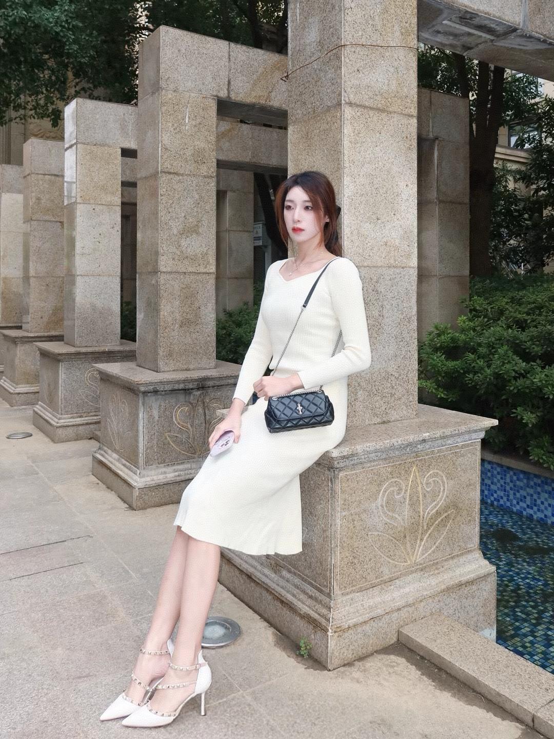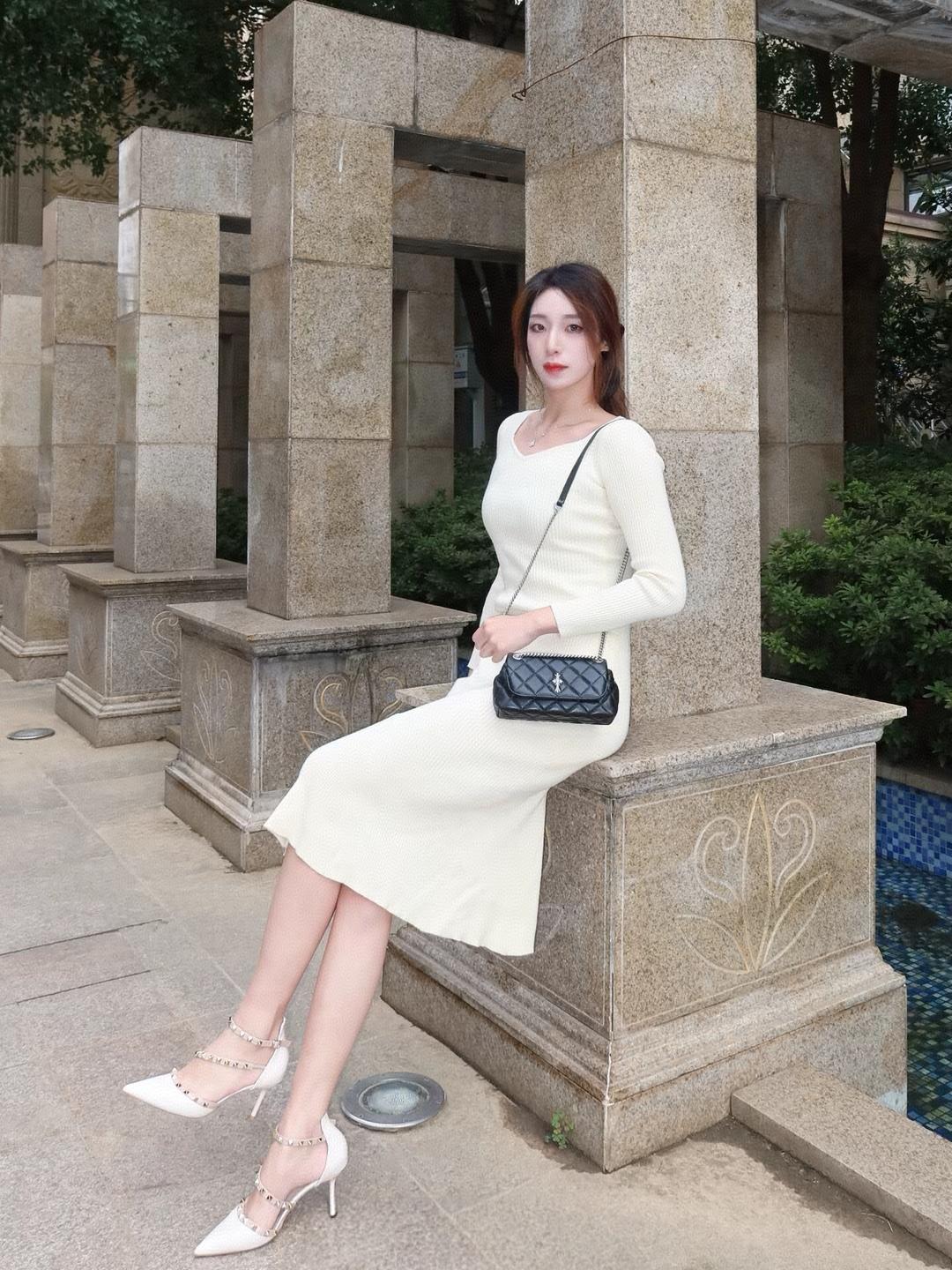 优雅气质穿搭,浅色系长袖连衣裙搭配高跟鞋,尽显女性魅力!连衣裙怎么穿有气质