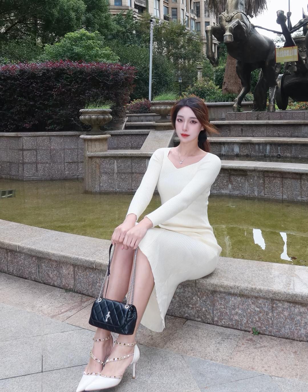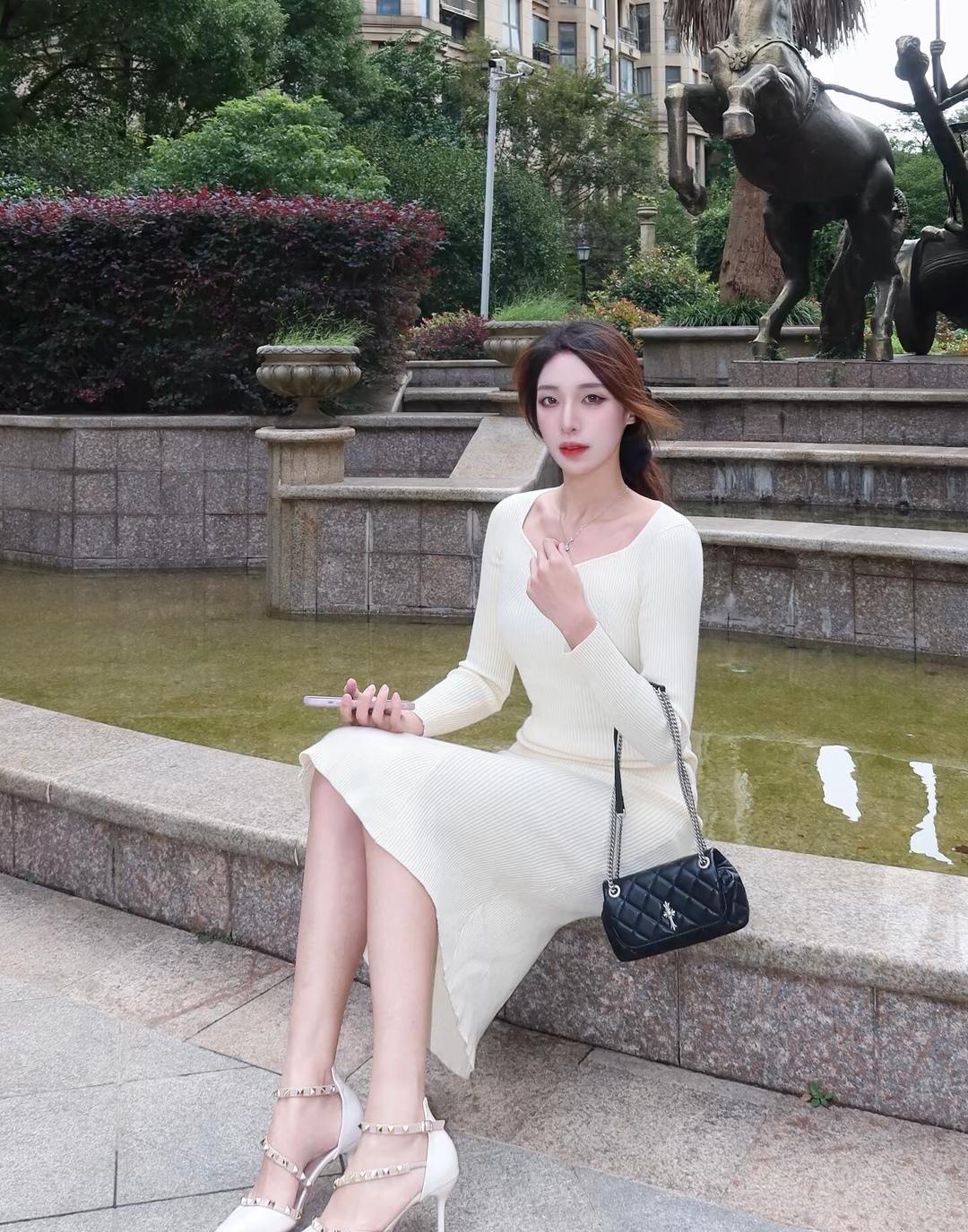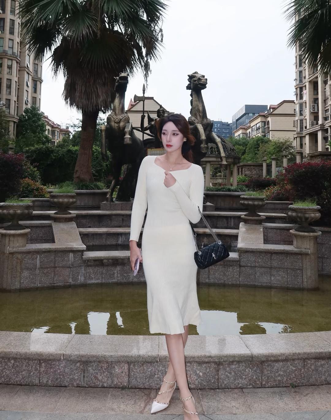 优雅气质穿搭,浅色系长袖连衣裙搭配高跟鞋,尽显女性魅力!连衣裙怎么穿有气质