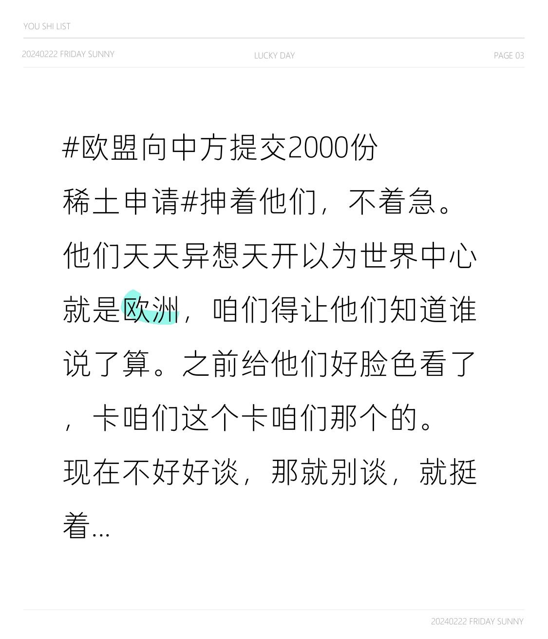抻着他们,不着急。他们天天异想天开以为世界中心就是欧洲,咱们得让他们知道谁说了算。 之前给他们好脸色看了,卡咱们这个卡咱们那个的。现在不好好谈,那就别谈,就挺着,看最后谁着急。