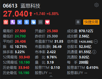 蓝思科技午后拉升超7%,触及27.5港元。截至发文,蓝思科技涨6.88%,成交额逾2.5亿港元。