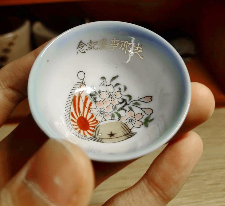 这是一只日本小清酒杯,杯子内部有日本军旗、头盔,还有文字,“国光”、“支那事变记念”。
